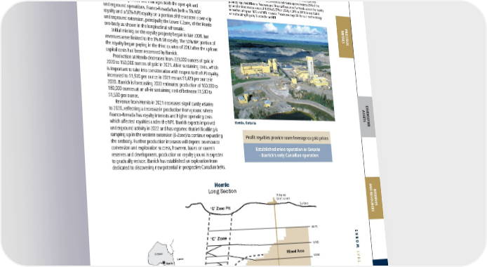 FRANCO-NEVADA CORPORATION 69 THE GOLD INVESTMENT THAT WORKS Hemlo Long Section ‘C’ Zone Pit Williams Shaft & Mill Surface Mined Area 3% NSR + 50% NPI ‘C’ Zone ‘B’ Zone 9975 9765 9555 9450 9240 9160 Mined Area Williams Mine Franco-Nevada Royalty Ground Hemlo Quebec Ontario Canada PRECIOUS METALS DIVERSIFIED ASSETS RESERVES AND RESOURCES ADDITIONAL INFORMATION 2021 2020 2019 Revenue to Franco-Nevada ($ million) $ 27.6 $ 69.9 $ 18.2 P&P Reserves (koz Au) 1 1,100 1,500 1,300 M&I Resource (koz Au) 1 2,600 3,300 3,150 Inferred Resource (koz Au) 1 820 900 1,000 P&P Royalty Ounces (000s) 2 54 76 55 M&I Royalty Ounces (000s) 1, 2 127 167 133 Inf Royalty Ounces (000s) 2 40 46 42 1 Please refer to the tables on pages 128-136 for a breakout of grade and tonnages by Mineral Resource category; all M&I categories are inclusive of Mineral Reserves 2 For Royalty Ounce calculation, Franco-Nevada estimates approximately 20% of the publicly reported Mineral Reserves and Mineral Resources for Hemlo are on its royalty ground and estimates a rate of 4.90% (5.07% in 2020, 4.21% in 2019) is applicable when factoring our NSR and NPI interests. Please see page 30 for our methodology on calculating Royalty Ounces for an NPI Hemlo Au Ontario, Canada Operator: Barrick Gold Corporation Royalty: NSR: 3% / NPI: 50% Precious Metals The Hemlo gold mine has been producing gold for over 30 years and is located adjacent to the Trans-Canada highway near Marathon, Ontario. Barrick is the operator and manages both the open-pit and underground operations. Franco-Nevada has both a 3% NSR royalty and a 50% NPI royalty on a portion of the western down-dip underground extension, principally the Lower C Zone, of the Hemlo ore-body as shown in the longitudinal schematic. Initial mining on the royalty property began in late 2008, but revenues were limited to the 3% NSR royalty. The 50% NPI portion of the royalty began paying in the third quarter of 2012 after the upfront capital costs had been recovered by Barrick. Production at Hemlo decreased from 223,000 ounces of gold in 2020 to 150,000 ounces of gold in 2021. All-in sustaining costs, which is important to take into consideration with respect to the NPI royalty, increased to $1,970 per ounce in 2021 versus $1,423 per ounce in 2020. Barrick is forecasting 2022 estimated production of 160,000 to 180,000 ounces at an all-in sustaining cost of between $1,510 to $1,590 per ounce. Revenue from Hemlo in 2021 decreased significantly relative to 2020, reflecting a decrease in production from ground where Franco-Nevada has royalty interests and higher operating costs which affected royalties under the NPI. Barrick expects improved underground activity in 2022 and has reported that infill drilling is ramping up in the western extension (E-Zone) to continue expanding the orebody. Further production increases will depend on resource conversion and exploration success, however, based on current reserves and development, production on royalty ground is expected to gradually reduce. Barrick has established an exploration team dedicated to discovering new potential in prospective Canadian belts. Profit royalties provide more leverage to gold prices Established mine operation in Ontario - Barrick’s only Canadian operation Hemlo, Ontario