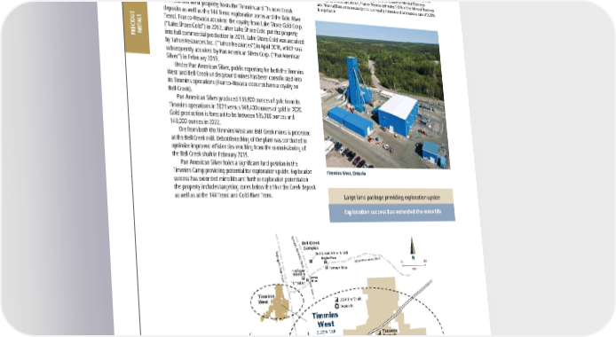 2022 ASSET HANDBOOK 74 FNV TSX NYSE 2021 2020 2019 Revenue to Franco-Nevada ($ million) $ 3.2 $ 3.2 $ 2.7 P&P Reserves (koz Au) 1 541 653 653 M&I Resource (koz Au) 1 675 1,040 1,040 Inferred Resource (koz Au) 1 24 1,161 1,161 P&P Royalty Ounces (000s) 2 12 15 15 M&I Royalty Ounces (000s) 1, 2 15 23 23 Inf Royalty Ounces (000s) 2 1 26 26 1 Please refer to the tables on pages 128-136 for a breakout of grade and tonnages by Mineral Resource category; all M&I categories are inclusive of Mineral Reserves 2 For Royalty Ounce calculation, Franco-Nevada estimates 100% of the Mineral Reserves and Mineral Resources are subject to our royalty interest and estimates a rate of 2.25% is applicable Timmins West Au Ontario, Canada Operator: Pan American Silver Corp. Royalty: NSR: 2.25% Precious Metals Franco-Nevada’s Timmins West 2.25% NSR royalty covers a large land package of approximately 130 km 2 to the west of the City of Timmins, Ontario. The Timmins West property hosts the Timmins and Thunder Creek deposits as well as the 144 Trend exploration zones and the Gold River Trend. Franco-Nevada acquired the royalty from Lake Shore Gold Corp. (“Lake Shore Gold”) in 2012, after Lake Shore Gold put the property into full commercial production in 2011. Lake Shore Gold was acquired by Tahoe Resources Inc. (“Tahoe Resources”) in April 2016, which was subsequently acquired by Pan American Silver Corp. (“Pan American Silver”) in February 2019. Under Pan American Silver, public reporting for both the Timmins West and Bell Creek underground mines has been consolidated into its Timmins operations (Franco-Nevada does not have a royalty on Bell Creek). Pan American Silver produced 133,800 ounces of gold from its Timmins operations in 2021 versus 148,400 ounces of gold in 2020. Gold production is forecast to be between 135,000 ounces and 143,000 ounces in 2022. Ore from both the Timmins West and Bell Creek mines is processed at the Bell Creek mill. Debottlenecking of the plant was conducted to optimize improved efficiencies resulting from the commissioning of the Bell Creek shaft in February 2019. Pan American Silver holds a significant land position in the Timmins Camp providing potential for exploration upside. Exploration success has extended mine life and further exploration potential on the property includes targeting zones below the Thunder Creek deposit as well as at the 144 Trend and Gold River Trend. Canada PRECIOUS METALS N N Bell Creek Mine & Mill Destor-Porcupine Fault Burrows Benedict Fault Mattagami River Fault Bell Creek Complex 4 kms Timmins Deposit Thunder Creek Deposit Gold River Trend 144 Gap Zone Deposit Timmins West 101 Timmins Km 0 20 Dome Mine Hollinger McIntyre Hoyle Pond Pamour Mine Timmins West 2.25% NSR UG Mine Shaft Deposits Timmins West Quebec Ontario Large land package providing exploration upside Exploration success has extended the mine life Timmins West, Ontario