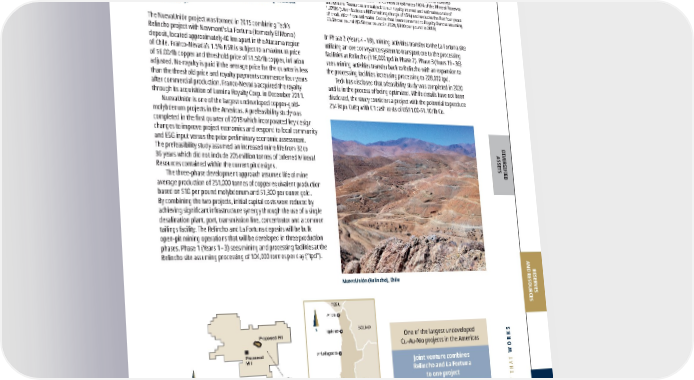 FRANCO-NEVADA CORPORATION 107 THE GOLD INVESTMENT THAT WORKS Diversified Assets – Other Mining DIVERSIFIED ASSETS RESERVES AND RESOURCES ADDITIONAL INFORMATION 2021 2020 2019 Revenue to Franco-Nevada ($ million) $ – $ – $ – P&P Reserves (Mlbs Cu) 1 12,078 12,078 11,862 M&I Resource (Mlbs Cu) 1 16,068 16,068 15,852 Inferred Resource (Mlbs Cu) 1 5,752 5,752 5,752 P&P Royalty Ounces (000s) 2 250 258 270 M&I Royalty Ounces (000s) 1, 2 349 359 379 Inf Royalty Ounces (000s) 2 143 147 157 1 Please refer to the tables on pages 128-136 for a breakout of grade and tonnages by Mineral Resource category; all M&I categories are inclusive of Mineral Reserves 2 For Royalty Ounce calculation, Franco-Nevada estimates 100% of the Mineral Reserves and Mineral Resources are subject to our royalty interest and estimates a rate of 1.275% (which factors a NSR smelting charge of 15%) and excludes the first four years of production from estimates. Copper has been converted to Royalty Ounces assuming $3.50 per pound ($3.50 per pound in 2020, $3.00 per pound in 2019) NuevaUnión (Relincho) Cu, Au, Mo Chile, South America Operator: Teck Resources Limited / Newmont Corporation Royalty: NSR: 1.5% Diversified Franco-Nevada has a 1.5% NSR royalty covering the Relincho property that is part of the NuevaUnión project being advanced by 50/50 joint venture partners, Teck Resources Limited (“Teck”) and Newmont Corporation (“Newmont”). The NuevaUnión project was formed in 2015 combining Teck’s Relincho project with Newmont’s La Fortuna (formerly El Morro) deposit, located approximately 40 km apart in the Atacama region of Chile. Franco-Nevada’s 1.5% NSR is subject to a maximum price of $6.00/lb copper and threshold price of $1.50/lb copper, inflation adjusted. No royalty is paid if the average price for the quarter is less than the threshold price and royalty payments commence four years after commercial production. Franco-Nevada acquired the royalty through its acquisition of Lumina Royalty Corp. in December 2011. NuevaUnión is one of the largest undeveloped copper-gold- molybdenum projects in the Americas. A prefeasibility study was completed in the first quarter of 2018 which incorporated key design changes to improve project economics and respond to local community and ESG input versus the prior preliminary economic assessment. The prefeasibility study assumed an increased mine life from 32 to 36 years which did not include 205 million tonnes of Inferred Mineral Resources contained within the current pit designs. The three-phase development approach assumed life of mine average production of 251,000 tonnes of copper equivalent production based on $10 per pound molybdenum and $1,300 per ounce gold. By combining the two projects, initial capital costs were reduced by achieving significant infrastructure synergy through the use of a single desalination plant, port, transmission line, concentrator and a common tailings facility. The Relincho and La Fortuna deposits will be bulk open-pit mining operations that will be developed in three production phases. Phase 1 (Years 1 - 3) sees mining and processing facilities at the Relincho site assuming processing of 104,000 tonnes per day (“tpd”). In Phase 2 (Years 4 - 18), mining activities transfer to the La Fortuna site utilizing an ore conveyance system to transport ore to the processing facilities at Relincho (116,000 tpd in Phase 2). Phase 3 (Years 19 - 36) sees mining activities transfer back to Relincho with an expansion to the processing facilities increasing processing to 208,000 tpd. Teck has disclosed that a feasibility study was completed in 2020 and is in the process of being optimized. While details have not been disclosed, the study considers a project with the potential to produce 254 ktpa CuEq with C1 cash costs of US$1.00-$1.10/lb Cu. N NuevaUnión (Relincho) Royalty Area 1.5% NSR Km 0 10 Mining and Royalty Area Pit Royalty Area Proposed Pit Proposed Mill N Arica Iquique Antofagasta La Serena Santiago Copiapo Relincho CHILE ARGENTINA BOLIVIA PERU Candelaria Marte-Lobo El Morro Pascua-Lama Cerro Casali Andacollo Regalito One of the largest undeveloped Cu-Au-Mo projects in the Americas Joint venture combines Relincho and La Fortuna to one project Project synergies estimated to significantly reduce capital expenditure NuevaUnión (Relincho), Chile