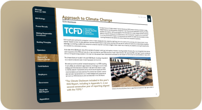FNV: TSX | NYSE 34 Approach to Climate Change TCFD Disclosure The Task Force on Climate-related Financial Disclosures (TCFD) seeks to develop consistent climate- related financial risk disclosures for companies in their financial and sustainability reporting. The TCFD considers the physical, liability and transition risks associated with climate change and what constitutes effective financial disclosures. The TCFD’s focus is not on companies’ impacts on the environment, it is on the environment’s impact on companies and can therefore be viewed as complementary to other reporting frameworks that address the carbon footprints of companies’ operations. TCFD is particularly pertinent for companies in which climate change genuinely presents a significant risk to the viability of the business, which does not solely involve physical impacts but also includes additional risks from transitioning to a lower-carbon economy. TCFD can also be used as an opportunity to demonstrate competitive advantage, by providing a platform for companies to describe how their businesses mitigate climate-related risks or how they are proactively pursuing the opportunities of a transition to a low-carbon economy. At the date of this ESG Report, many of the operators of projects in which we hold royalties or streams, including operators of several of our key mining assets have become public supporters of the TCFD and many do, or have committed to, have TCFD-compliant climate-related disclosure. We expect that TCFD reporting will become mainstream with our mining and energy operators in the near term. We applaud these initiatives and we declared our own support for the TCFD and its recommendations in early 2021. The climate disclosure included in this year’s ESG Report, including in Appendix C, is our second consecutive year of reporting aligned with the TCFD. We continue to aim to provide increased transparency in our TCFD reporting. In early 2022, we conducted a gap analysis by reviewing our current climate strategy and TCFD disclosure contained in last year’s ESG Report in order to identify areas for improvement and to ensure we are aligned with TCFD recommendations and best practices. This process has resulted in several year-over-year improvements to our climate strategies and procedures as well as to our TCFD disclosure, which are described in this ESG Report. Ambulance fleet donated by Kinross Tasiast to support Mauritanian government’s fight against COVID-19 “The Climate Disclosure included in this year’s ESG Report, including in Appendix C, is our second consecutive year of reporting aligned with the TCFD.”
