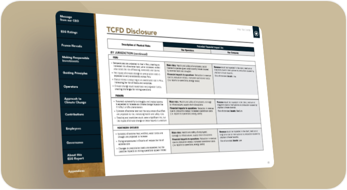 FNV: TSX | NYSE 85 TCFD Disclosure Description of Physical Risks Potential Financial Impact for: Our Operators Our Company BY JURISDICTION (continued) PERU • Temperatures are projected to rise in Peru, creating an increased risk of extreme heat, while increased rainfall also raises the risk of flooding, landslides and storms • The impact of climate change on precipitation rates is expected to vary considerably across Peru • Glacial retreat is occurring at an accelerated rate in Peru, increasing the risk of floods and landslides • Climate change could exacerbate existing water stress, creating challenges for mining operations Main risks : Health and safety of employees; social license to operate given water scarcity issues caused by extreme heat and droughts Financial impacts to operations : Reduction in revenue due to production delays; increased operational costs (i.e. repairs to operations, energy costs) Revenue could be impacted in the short, medium or long-term due to interruptions to production caused by physical climate hazards. Risk of stranded Assets : Low PANAMA • Panama’s vulnerability to droughts and tropical storms is expected to increase as climate change impacts the El Niño/La Niña phenomenon • Episodes of extreme heat and the occurrence of wildfires are projected to rise, increasing health and safety risks • Flooding and landslides could pose a significant risk, but the impact of climate change on these hazards is uncertain Main risks : Health and safety of employees, damage to infrastructure; supply chain disruptions Financial impacts to operations : Reduction in revenue due to production delays; increased operational costs (i.e. repairs to operations, energy costs) Revenue could be impacted in the short, medium or long-term due to interruptions to production caused by physical climate hazards. Risk of stranded Assets : Medium NORTHERN ONTARIO • Episodes of extreme heat, wildfires, water stress and drought are projected to increase • Rising temperatures in Ontario will reduce the risk of extreme cold • Changes to precipitation levels are expected, but the possible impacts on mining operations appear limited Main risks: Health and safety of employees; damage to infrastructure; supply chain disruptions Financial impacts to operations: Reduction in revenue due to production delays; increased operational costs (i.e. repairs to operations, energy costs) Revenue could be impacted in the short, medium or long-term due to interruptions to production caused by physical climate hazards. Risk of stranded Assets : Low