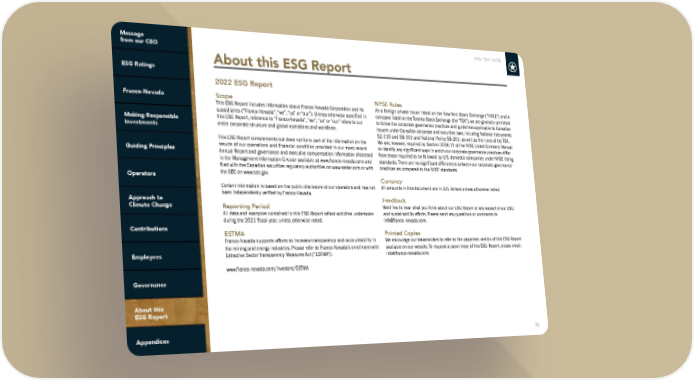 FNV: TSX | NYSE 70 About this ESG Report Scope This ESG Report includes information about Franco-Nevada Corporation and its subsidiaries (“Franco-Nevada”, “we”, “us” or “our”). Unless otherwise specified in this ESG Report, reference to “Franco-Nevada”, “we”, “us” or “our” refers to our entire corporate structure and global operations and workforce. This ESG Report complements but does not form part of the information on the results of our operations and financial condition provided in our most recent Annual Report and governance and executive compensation information disclosed in the Management Information Circular available at www.franco-nevada.com and filed with the Canadian securities regulatory authorities on www.sedar.com or with the SEC on www.sec.gov. Certain information is based on the public disclosure of our operators and has not been independently verified by Franco-Nevada. Reporting Period All data and examples contained in this ESG Report reflect activities undertaken during the 2021 fiscal year, unless otherwise noted. ESTMA Franco-Nevada supports efforts to increase transparency and accountability in the mining and energy industries. Please refer to Franco-Nevada’s enrollment with Extractive Sector Transparency Measures Act (“ESTMA”): www.franco-nevada.com/investors/ESTMA NYSE Rules As a foreign private issuer listed on the New York Stock Exchange (“NYSE”) and a company listed on the Toronto Stock Exchange (the “TSX”), we are generally permitted to follow the corporate governance practices and guidelines applicable to Canadian issuers under Canadian corporate and securities laws, including National Instruments 52-110 and 58-101 and National Policy 58-201, as well as the rules of the TSX. We are, however, required by Section 303A.11 of the NYSE Listed Company Manual to identify any significant ways in which our corporate governance practices differ from those required to be followed by U.S. domestic companies under NYSE listing standards. There are no significant differences between our corporate governance practices as compared to the NYSE standards. Currency All amounts in this document are in U.S. dollars unless otherwise noted. Feedback We’d like to hear what you think about our ESG Report or any aspect of our ESG and sustainability efforts. Please send any questions or comments to [email protected]. Printed Copies We encourage our stakeholders to refer to the paperless version of this ESG Report available on our website. To request a paper copy of this ESG Report, please email: [email protected]. 2022 ESG Report
