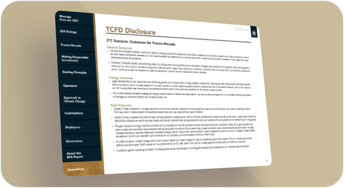 FNV: TSX | NYSE 100 TCFD Disclosure General Outcomes • Extreme and persistent weather events and patterns causing production delays and intermittent cessations of production at gold and energy operations in which we hold royalty and stream interests, will only have the effect of a deferral of our revenue over short or medium-term horizons, realizable in the longer term upon recommencement of operations. • Inevitable increased capital and operating costs (including carbon pricing costs) due to mandatory changes and transitions resulting from policy and regulatory reform will be borne by our operators. Subject to instances where higher cost projects are rendered uneconomic and are temporarily or permanently abandoned, we will continue to have no exposure to costs of operations in which we hold royalty and stream interests. Energy Outcomes • Lower demand for oil will reduce the level of drilling activity on a number of our energy portfolio investments, reducing the rate of production from those assets. While the rate of return on these assets will be lower, subject to certain assets being permanently abandoned due to decreased demand, much of the resource will still be exploited over time due to the demand for fossil fuels in the continuing transition to low-carbon energy sources. • Our current capital allocation strategy for energy opportunities will remain the same. We will not look to grow the energy mix in our portfolio through acquisition to manage our exposure to fossil fuel related climate risk. Gold Outcomes • Greater climate impacts will increase sensitivity to the environmental impacts of mining operations, making the permitting of new mines increasingly difficult. This may result in development of brownfields assets over which we have existing royalty interests. • Carbon pricing increases the costs of many mining operations impacting the viability of some operations with higher cost structures and/or large carbon footprints. Most of the projects over which we have royalty and stream interests have strong economics and such projects are not expected to be stranded due to rising costs. • The gold industry is energy intensive and there will be reputational risks for operators that do not decarbonize their operations. Many of our gold operators are best-in-class and have taken steps towards making low-carbon transitions. To the extent that our gold operators make strides towards decarbonization through increased access to low-cost large-scale renewable energy that will reduce their carbon footprint heavily weighted to electricity, this will mitigate climate-related reputational risk for such operators, and indirectly for our company, due to decreased reliance on fossil fuels. • The effort to tackle climate change and to cover losses created by climate change will require substantial government capital. This will increase government deficits and debt loads. Gold’s appeal will be preserved due to its “safe haven” role and as a hedge against the devaluation of national currencies. • In addition, gold’s increasing utilization in emerging low-carbon technologies, including gold catalysts and photovoltaics, will modestly add to demand. 2°C Scenario: Outcomes for Franco-Nevada