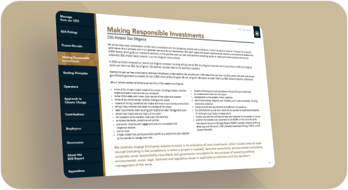 FNV: TSX | NYSE 10 Making Responsible Investments ESG-Related Due Diligence We believe that proper consideration of ESG risks in connection with the companies, projects and jurisdictions in which we seek to invest will enhance the long-term performance of our company and in turn generate real value for our shareholders. With each royalty and stream opportunity we conduct a comprehensive assessment of ESG factors, which guide our investment decisions. In the past few years, we have refrained from allocating capital to royalty and stream opportunities due to unfavorable ESG-related issues revealed in our due diligence review process. In 2020, we further enhanced our internal due diligence processes including refining internal ESG due diligence checklists, which helps direct our ESG due diligence review and inform our ESG due diligence informational requests made to the applicable operators. Starting this year, we have subscribed to McKinsey’s MineSpans, a data platform that provides over 1,000 data points per mine, including carbon and other greenhouse gas emissions generated by projects, for over 3,800 mines across the globe. We are using this information to better inform our ESG review of potential investments. We will typically assess the following as part of our ESG-related due diligence: • review of the climate-related impact of the project, including emission reduction targets and goals to achieve net-zero emissions • review of the safety and human rights records of the project and operator • review of any environmental incidents relating to the project • impacts of mining, operations and related activities on surrounding communities • tailings impoundments and waste rock storage at the project • water requirements, water sourcing and responsible water management plans • ethical track record and any history of corruption • the reputation of the operator, locally and internationally • workplace standards, protections and policies • community initiatives and engagement and prior consultation with indigenous peoples • closure plans • climate-related risks and opportunities specific to a project and plans adopted by the operator to manage such risks • impacts of development and operations on fauna, flora and biodiversity • air emissions and dust from the project • management by the operator of toxic materials • other environmental programs and initiatives put in place by operator including biodiversity protection • energy sources and requirements and efficiency of operations • the commitments by, and track record of, the operator to fundamental freedoms of individuals (e.g. freedom of association) • whether any external certifications have been obtained by the operator or project • whether the operator has committed to the RGMPs or the principles of the International Council on Mining & Metals (“ICMM”), Canadian Institute of Mining Metallurgy and Petroleum (“CIM”), Towards Sustainable Mining (“TSM”) or other relevant standards We routinely engage third-party experts to assist in its evaluation of new investments, which include external legal counsel (including in the jurisdictions in which a project is located), technical consultants, environmental consultants, corporate social responsibility consultants and governance consultants for the purpose of assessing political, environmental, social, legal, technical and regulatory issues in applicable jurisdictions and the operator’s management of the same.