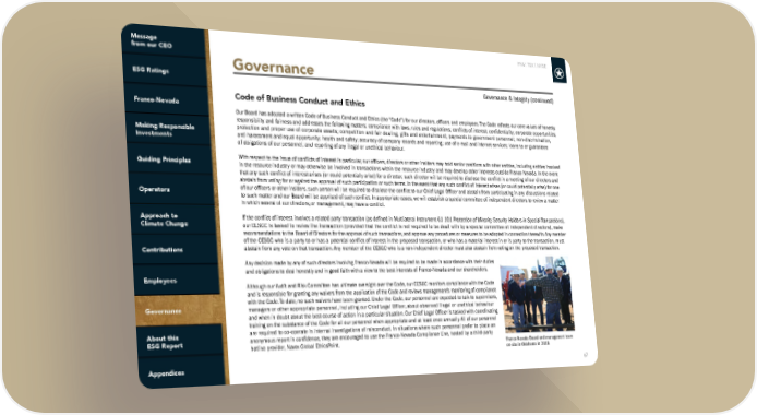 FNV: TSX | NYSE 67 Code of Business Conduct and Ethics Our Board has adopted a written Code of Business Conduct and Ethics (the “Code”) for our directors, officers and employees. The Code reflects our core values of honesty, responsibility and fairness and addresses the following matters: compliance with laws, rules and regulations; conflicts of interest; confidentiality; corporate opportunities; protection and proper use of corporate assets; competition and fair dealing; gifts and entertainment; payments to government personnel; non-discrimination, anti-harassment and equal opportunity; health and safety; accuracy of company records and reporting; use of e-mail and internet services; loans to or guarantees of obligations of our personnel; and reporting of any illegal or unethical behaviour. With respect to the issue of conflicts of interest in particular, our officers, directors or other insiders may hold senior positions with other entities, including entities involved in the resource industry or may otherwise be involved in transactions within the resource industry and may develop other interests outside Franco-Nevada. In the event that any such conflict of interest arises (or could potentially arise) for a director, such director will be required to disclose the conflict in a meeting of our directors and abstain from voting for or against the approval of such participation or such terms. In the event that any such conflict of interest arises (or could potentially arise) for one of our officers or other insiders, such person will be required to disclose the conflict to our Chief Legal Officer and abstain from participating in any discussions related to such matter and our Board will be apprised of such conflict. In appropriate cases, we will establish a special committee of independent directors to review a matter in which several of our directors, or management, may have a conflict. If the conflict of interest involves a related party transaction (as defined in Multilateral Instrument 61-101 Protection of Minority Security Holders in Special Transactions ), our CESGC is tasked to review the transaction (provided that the conflict is not required to be dealt with by a special committee of independent directors), make recommendations to the Board of Directors for the approval of such transactions, and approve any procedures or measures to be adopted in connection therewith. Any member of the CESGC who is a party to or has a potential conflict of interest in the proposed transaction, or who has a material interest in or is party to the transaction, must abstain from any vote on that transaction. Any member of the CESGC who is a non-independent director must also abstain from voting on the proposed transaction. Any decision made by any of such directors involving Franco-Nevada will be required to be made in accordance with their duties and obligations to deal honestly and in good faith with a view to the best interests of Franco-Nevada and our shareholders. Although our Audit and Risk Committee has ultimate oversight over the Code, our CESGC monitors compliance with the Code and is responsible for granting any waivers from the application of the Code and reviews management’s monitoring of compliance with the Code. To date, no such waivers have been granted. Under the Code, our personnel are expected to talk to supervisors, managers or other appropriate personnel, including our Chief Legal Officer, about observed illegal or unethical behaviour and when in doubt about the best course of action in a particular situation. Our Chief Legal Officer is tasked with coordinating training on the substance of the Code for all our personnel when appropriate and at least once annually. All of our personnel are required to co-operate in internal investigations of misconduct. In situations where such personnel prefer to place an anonymous report in confidence, they are encouraged to use the Franco-Nevada Compliance Line, hosted by a third-party hotline provider, Navex Global EthicsPoint. Franco-Nevada Board and management team on-site in Oklahoma in 2018 Governance & Integrity (continued) Governance