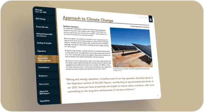FNV: TSX | NYSE 38 Approach to Climate Change Resilient Operators Our investments in organizations, projects and initiatives developing adaptive capacity to respond to climate change to better manage climate-related risks and seize opportunities may improve our own reputation, market valuation and resilience to the transition to a low-carbon economy. Many of the assets in our portfolio are operated by best-in-class operators. The ingenuity and technical skills of these operators, including relating to sustainable practices, processes and technologies, often provide them with a competitive advantage, reducing their costs and their operating risks and ultimately reducing their cost of capital. Mining and energy operators, including most of our key operators described above in the Operators section of this ESG Report, contributing to approximately two-thirds of our 2021 revenues have proactively set targets to reduce carbon emissions, with some committing to the long-term achievement of net-zero emissions. We continue to look for opportunities to invest in other best-in-class operators and, as a capital provider, potentially facilitate their low-carbon transitions. Below we have highlighted the resourcefulness of certain of our operators, their efforts to reduce their carbon footprints, and their commitments to combating climate change, which exemplify the types of operators and operations that we look to invest in. Continental Resources’ solar panels at West Blaine recycling facility, which Franco-Nevada is helping to finance Climate Opportunities (continued) “Mining and energy operators, including most of our key operators described above in the Operators section of this ESG Report, contributing to approximately two-thirds of our 2021 revenues have proactively set targets to reduce carbon emissions, with some committing to the long-term achievement of net-zero emissions.”