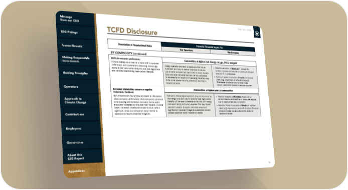 FNV: TSX | NYSE 90 TCFD Disclosure Description of Reputational Risks Potential Financial Impact for: Our Operators Our Company BY COMMODITY (continued) Shifts in consumer preferences: Climate change could lead to a moral shift in customer preferences, with stakeholders becoming increasingly aware of their own carbon footprint and new regulations and policies incentivising lower-carbon lifestyles. Commodities at highest risk: Energy (oil, gas, NGLs) and gold Energy operators are most vulnerable to this risk as customers are likely to receive incentives to reduce use of these commodities due to their climate impacts. Gold and other commodities that are not considered to be essential to industry or the energy transition may come under greater scrutiny, potentially resulting in reduced demand. • Potential reduction of Revenues if demand for carbon-intensive commodities or assets are reduced due to shift in preferences • Potential impact to valuation of Assets on balance sheet (e.g. impairment or write-off of assets) if decrease in demand and/or lower prices causes uneconomic assets to become stranded Increased stakeholder concern or negative stakeholder feedback: With stakeholders having growing access to information about company performance, those companies perceived to be causing environmental and social harms could encounter increased scrutiny over their impacts. In some cases, increased stakeholder concerns could pose a significant threat to a company’s social license to operate and require proactive mitigation. Commodities at highest risk: All commodities Operators producing commodities that are not critical to the energy transition and/or typically have high-carbon intensity will be most vulnerable to this risk, with energy producers being particularly exposed. This may impact operator’s access to capital and asset valuations significantly impacted if negative stakeholder concern erodes operators’ social license to operate. • Potential reduction of Revenues if demand for carbon-intensive commodities or assets are reduced due to negative feedback or concern • Potential impact to valuation of Assets on balance sheet (e.g. impairment or write-off of assets) if erosion of social license causes uneconomic assets to become stranded
