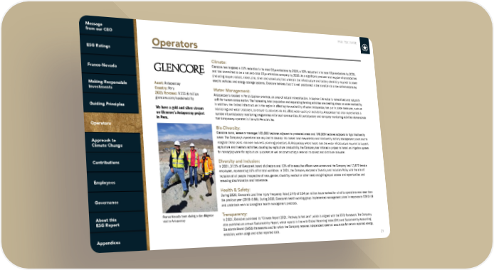 FNV: TSX | NYSE 21 Operators Asset: Antapaccay Country: Peru 2021 Revenue: $111.6 million glencore.com/sustainability We have a gold and silver stream on Glencore’s Antapaccay project in Peru. Climate: Glencore has targeted a 15% reduction in its total CO 2 e emissions by 2026, a 50% reduction in its total CO 2 e emissions by 2035, and has committed to be a net-zero total CO 2 e emissions company by 2050. As a significant producer and recycler of commodities (including copper, cobalt, nickel, zinc, silver and vanadium) that underpin the infrastructure and battery chemistry required to power electric vehicles and energy storage systems, Glencore believes that it is well positioned in the transition to a low-carbon economy. Water Management: Antapaccay is located in Peru’s Espinar province, an area of natural mineralisation. In Espinar, the water is mineralised and naturally unfit for human consumption. The increasing local population and expanding farming activities are creating stress on water availability. In addition, the limited infrastructure in the region is affecting the availability of water. Antapaccay has put in place measures, such as monitoring and water treatment, to ensure its activities do not affect water quality or availability. Antapaccay has also implemented a number of participatory monitoring programmes with local communities. All participatory and company monitoring activities demonstrate that Antapaccay operates in line with Peruvian law. Bio-Diversity: Glencore owns, leases or manages 105,000 hectares adjacent to protected areas and 188,000 hectares adjacent to high biodiversity areas. The Company’s operations are required to develop risk-based land stewardship and biodiversity action/management plans and to integrate these plans into core business planning processes. At Antapaccay, where locals lack the water infrastructure required to support agriculture and livestock activities, causing low agricultural productivity, the Company has initiated a project to install an irrigation system for managing water for agricultural purposes as well as constructing a reservoir to collect and distribute rainwater. Diversity and Inclusion: In 2021, 37.5% of Glencore’s board of directors and 13% of its executive officers were women and the Company had 13,875 female employees, representing 16% of its total workforce. In 2021, the Company adopted a Diversity and Inclusion Policy with the aim of inclusion of all people irrespective of race, gender, disability, medical or other need and giving equal access and opportunities and removing discrimination and intolerance. Health & Safety: During 2020, Glencore’s Lost Time Injury Frequency Rate (LTIFR) of 0.94 per million hours worked for all of its operations was lower than the previous year (2019: 0.99). During 2020, Glencore’s health working group implemented management plans in response to COVID-19 and undertook work to strengthen health management practices. Transparency: In 2021, Glencore published its “Climate Report 2021: Pathway to Net-zero”, which is aligned with the TCFD framework. The Company also publishes an annual Sustainability Report, which reports in line with Global Reporting Index (GRI) and Sustainability Accounting Standards Board (SASB) frameworks and for which the Company receives independent external assurance for certain reported energy, emission, water usage and other reported data. Franco-Nevada team during a due diligence visit to Antapaccay