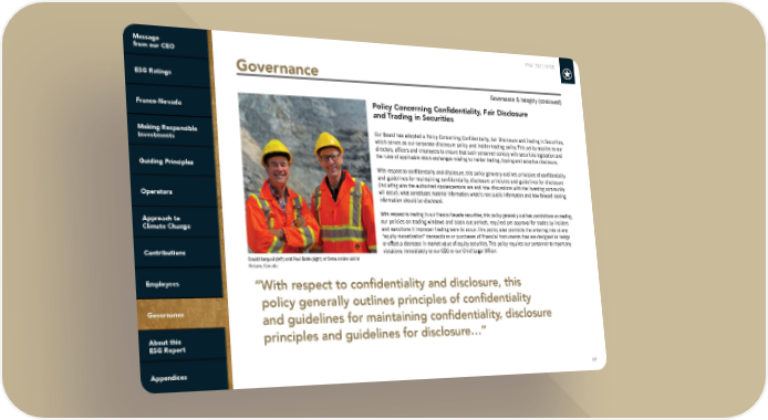 FNV: TSX | NYSE 69 Policy Concerning Confidentiality, Fair Disclosure and Trading in Securities Our Board has adopted a Policy Concerning Confidentiality, Fair Disclosure and Trading in Securities, which serves as our corporate disclosure policy and insider trading policy. This policy applies to our directors, officers and employees to ensure that such personnel comply with securities legislation and the rules of applicable stock exchanges relating to insider trading, tipping and selective disclosure. With respect to confidentiality and disclosure, this policy generally outlines principles of confidentiality and guidelines for maintaining confidentiality, disclosure principles and guidelines for disclosure (including who the authorized spokespersons are and how discussions with the investing community will occur), what constitutes material information, what is non-public information and how forward-looking information should be disclosed. With respect to trading in our Franco-Nevada securities, this policy generally outlines prohibitions on trading, our policies on trading windows and black-out periods, required pre-approval for trades by insiders and sanctions if improper trading were to occur. This policy also prohibits the entering into of any “equity monetization” transactions or purchases of financial instruments that are designed to hedge or offset a decrease in market value of equity securities. This policy requires our personnel to report any violations immediately to our CEO or our Chief Legal Officer. “With respect to confidentiality and disclosure, this policy generally outlines principles of confidentiality and guidelines for maintaining confidentiality, disclosure principles and guidelines for disclosure...” Governance & Integrity (continued) David Harquail (left) and Paul Brink (right) at Detour mine visit in Ontario, Canada Governance