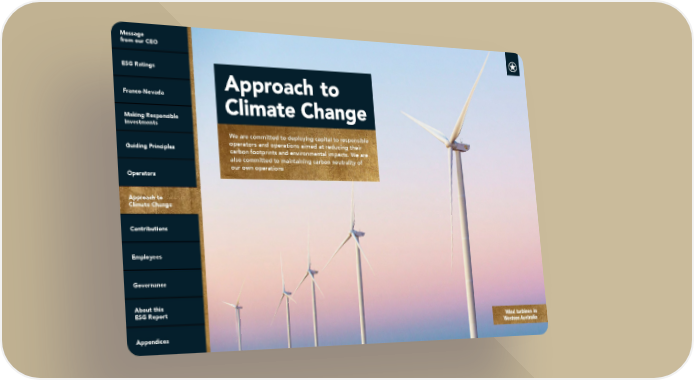 We are committed to deploying capital to responsible operators and operations aimed at reducing their carbon footprints and environmental impacts. We are also committed to maintaining carbon neutrality of our own operations Wind turbines in Western Australia