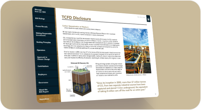 FNV: TSX | NYSE 95 TCFD Disclosure Carbon Sequestration at Weyburn (Franco-Nevada has royalty interests and a working interest at Weyburn) We have royalty interests and a working interest on Whitecap Resources’ Weyburn Unit in southeast Saskatchewan, which is a CO 2 injection enhanced oil recovery development. CO 2 is transported as a liquid from two separate industrial sources. At the source, the CO 2 is captured and compressed before transmission via pipeline to Weyburn. The CO 2 in liquid form is then injected at high pressure into the Weyburn Unit. The gas stream that is recovered with the oil production is processed for natural gas liquids and the remaining CO 2 volume is reinjected into the formation on an ongoing basis. Accordingly, with minor adjustment for losses, all of the CO 2 purchased and transported by pipeline for injection at Weyburn constitutes additional CO 2 volumes stored each year. Since its inception in 2000, more than 37 million tonnes of CO 2 from two separate industrial sources have been captured and stored 1.5 km underground, the equivalent of taking 8 million cars off the road for an entire year. In addition to having carbon storage benefits, injecting CO 2 helps oil come to the surface more easily and improves the efficiency of production, maximizing the ultimate recovery of oil originally in place. “Since its inception in 2000, more than 37 million tonnes of CO 2 from two separate industrial sources have been captured and stored 1.5 km underground, the equivalent of taking 8 million cars off the road for an entire year.” Utilizing emissions-reduction processes at Weyburn Enhanced Oil Recovery CO 2 Mining and energy operators utilizing lower emission and emissions reduction processes and technologies demonstrate their adaptability to climate change. As decarbonisation continues to take centre stage, we will continue to look to partner with and invest in these companies and projects, which involvement will improve our own sustainability profile.