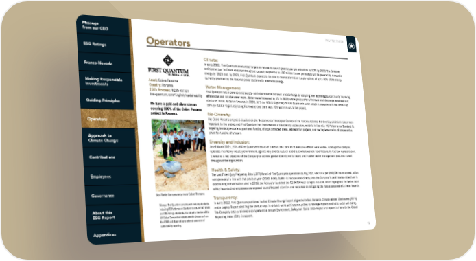 FNV: TSX | NYSE 19 Operators Climate: In early 2022, First Quantum announced targets to reduce its overall greenhouse gas emissions by 50% by 2030. The Company anticipates that its Cobre Panama throughput capacity expansion to 100 million tonnes per annum will be powered by renewable energy by 2023 and, by 2025, First Quantum expects to be able to source alternative supply options of up to 50% of the energy currently provided by the Panama power station with renewable energy. Water Management: First Quantum has a core commitment to minimise water withdrawal and discharge by adopting new technologies, continually improving efficiencies and on site water reuse. Water reuse increased by 1% in 2020, while group water withdrawal and discharge remained very similar to 2019. At Cobre Panama in 2020, 81% (or 468.5 Gigalitres) of First Quantum’s water usage is seawater with the remaining 19% (or 113.3 Gigalitres) being fresh water and there was 70% water reuse at the project. Bio-Diversity: The Cobre Panama project is situated on the Mesoamerican Biological Corridor of the Panama Atlantic. Bio-diversity protection is extremely important to the project and First Quantum has implemented a bio-diversity action plan, which is in line with IFC Performance Standard 6, targeting landscape-scale support and funding of local protected areas, reforestation projects, and the implementation of conservation plans for species of concern. Diversity and Inclusion: As of March 2021, 25% of First Quantum’s board of directors and 28% of its executive officers were women. Although the Company operates in a heavy industry environment against very diverse cultural backdrops where women have historically had low representation, it remains a key objective of the Company to achieve gender diversity on its board and in other senior management positions as well throughout the organization. Health & Safety: The Lost Time Injury Frequency Rate (LTIFR) for all of First Quantum’s operations during 2021 was 0.07 per 200,000 hours worked, which was generally in line with the previous year (2020: 0.06). Safety is incorporated directly into the Company’s performance objectives in determining compensation and in 2018, the Company launched the 12 THINK Fatal dangers initiative, which highlighted the twelve main safety hazards that employees are exposed to and focused attention and resources on mitigating the risks associated with these hazards. Transparency: In early 2022, First Quantum published its first Climate Change Report aligned with Task Force on Climate-related Disclosures (TCFD) and a Legacy Report detailing the various ways in which it works within communities to manage impacts and build social well-being. The Company also publishes a comprehensive annual Environment, Safety and Social Data Report and reports in line with the Global Reporting Index (GRI) framework. Whereas First Quantum complies with industry standards, including IFC Performance Standard 6 and ANCOLD, ICMM and CDA tailings standards, it is not yet a member of the UN Global Compact or industry-specific groups such as the ICMM and does not have external assurance of sustainability reporting. Asset: Cobre Panama Country: Panama 2021 Revenue: $235 million first-quantum.com/English/sustainability We have a gold and silver stream covering 100% of the Cobre Panama project in Panama. Sea Turtle Conservancy near Cobre Panama