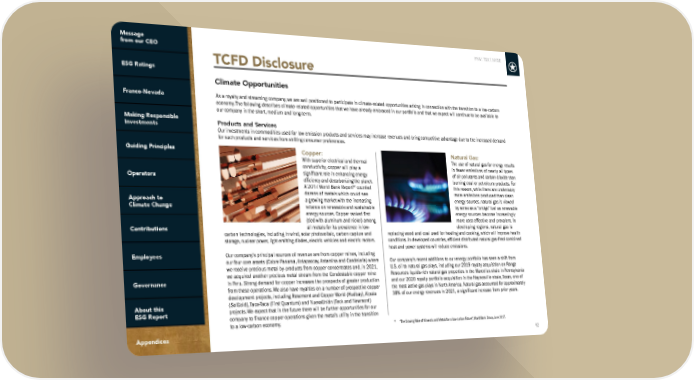 FNV: TSX | NYSE 92 TCFD Disclosure Climate Opportunities As a royalty and streaming company, we are well positioned to participate in climate-related opportunities arising in connection with the transition to a low-carbon economy. The following describes climate-related opportunities that we have already embraced in our portfolio and that we expect will continue to be available to our company in the short, medium and long-term. Products and Services Our investments in commodities used for low emission products and services may increase revenues and bring competitive advantage due to the increased demand for such products and services from shifting consumer preferences. * “The Growing Role of Minerals and Metals for a Low-carbon Future”, World Bank Group, June 2017. Copper: With superior electrical and thermal conductivity, copper will play a significant role in enhancing energy efficiency and decarbonizing the planet. A 2017 World Bank Report* counted dozens of metals which could see a growing market with the increasing reliance on renewable and sustainable energy sources. Copper ranked first (tied with aluminum and nickel) among all metals for its prevalence in low- carbon technologies, including in wind, solar photovoltaic, carbon capture and storage, nuclear power, light emitting diodes, electric vehicles and electric motors. Our company’s principal sources of revenue are from copper mines, including our four core assets (Cobre Panama, Antapaccay, Antamina and Candelaria) where we receive precious metal by-products from copper concentrates and, in 2021, we acquired another precious metal stream from the Condestable copper mine in Peru. Strong demand for copper increases the prospects of greater production from these operations. We also have royalties on a number of prospective copper development projects, including Rosemont and Copper World (Hudbay), Alpala (SolGold), Taca-Taca (First Quantum) and NuevaUnión (Teck and Newmont) projects. We expect that in the future there will be further opportunities for our company to finance copper operations given the metal’s utility in the transition to a low-carbon economy. Natural Gas: The use of natural gas for energy results in fewer emissions of nearly all types of air pollutants and carbon dioxide than burning coal or petroleum products. For this reason, while there are undeniably more emissions produced than clean energy sources, natural gas is viewed by some as a “bridge” fuel as renewable energy sources become increasingly more cost-effective and prevalent. In developing regions, natural gas is replacing wood and coal used for heating and cooking, which will improve health conditions. In developed countries, efficient distributed natural gas-fired combined heat and power systems will reduce emissions. Our company’s recent additions to our energy portfolio has seen a shift from U.S. oil to natural gas plays, including our 2019 royalty acquisition on Range Resources liquids-rich natural gas properties in the Marcellus shale in Pennsylvania and our 2020 royalty portfolio acquisition in the Haynesville shale, Texas, one of the most active gas plays in North America. Natural gas accounted for approximately 38% of our energy revenues in 2021, a significant increase from prior years.
