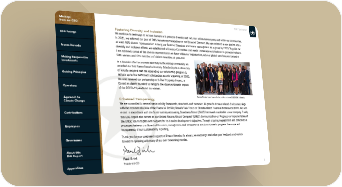FNV: TSX | NYSE 5 Fostering Diversity and Inclusion. We continue to seek ways to remove barriers and promote diversity and inclusion within our company and within our communities. In 2021, we achieved our goal of 30% female representation on our Board of Directors. We also adopted a new goal to attain at least 40% diverse representation among our Board of Directors and senior management as a group by 2025. To guide our diversity and inclusion efforts, we established a Diversity Committee that made immediate contributions to promote inclusion. I am extremely proud of the diverse representation we have within our organization, with our global workforce comprised of 50% women and 42% members of visible minorities at year-end. In a broader effort to promote diversity in the mining community, we awarded our first Franco-Nevada Diversity Scholarship to a University of Toronto recipient and are expanding our scholarship program to include up to four additional scholarship awards beginning in 2022. We also renewed our partnership with The Prosperity Project, a Canadian charity founded to mitigate the disproportionate impact of the COVID-19 pandemic on women. Enhanced Transparency. We are committed to several sustainability frameworks, standards and initiatives. We provide climate-related disclosure to align with the recommendations of the Financial Stability Board’s Task Force on Climate-related Financial Disclosures (TCFD). We also report in accordance with the Sustainability Accounting Standards Board (SASB) framework applicable to our company. Finally, this ESG Report also serves as our United Nations Global Compact (UNGC) Communication on Progress on implementation of the UNGC Ten Principles and support for its broader development objectives. Through ongoing engagement and collaborative processes between our Board of Directors, management and investors we aim to continue to progress the scope and transparency of our sustainability reporting. Thank you for your continued support of Franco-Nevada. As always, we encourage and value your feedback and we look forward to speaking with many of you over the coming months. Paul Brink President & CEO Franco-Nevada team from all of our offices at our 2019 AGM in Toronto