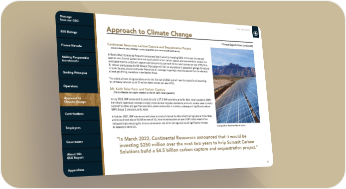 FNV: TSX | NYSE 40 Continental Resources Carbon Capture and Sequestration Project (Franco-Nevada has a strategic royalty acquisition joint venture with Continental) In March 2022, Continental Resources announced that it would be investing $250 million over the next two years to help Summit Carbon Solutions build a $4.5 billion carbon capture and sequestration project. It is anticipated that the project will capture and transport via pipeline 8 million metric tonnes per year of CO 2 from 31 ethanol plants across the US Midwest. That carbon will then be sequestered in subsurface geologic formations in North Dakota, where Continental Resources will leverage its geologic expertise gained from its extensive oil and gas drilling operations in the Bakken Shale. The project aims to bring operations online the first half of 2024 and will have the capability of expanding to ultimately transport up to 20 million metric tonnes per year of CO 2 . Mt. Keith Solar Farm and Carbon Capture (Franco-Nevada has royalty interests on the Mt. Keith nickel operation) In July 2021, BHP announced its plans to build a 27.4 MW solar farm at its Mt. Keith nickel operations, BHP’s first off-grid large-scale renewable energy project across its global operations, which will replace power currently supplied by diesel and gas. The solar farm, where construction is currently underway, will significantly reduce BHP’s Scope 2 emissions at Mt. Keith. In October 2021, BHP also announced plans to conduct trials at the Mount Keith tailings dam at Nickel West, which could store about 40,000 tonnes of CO 2 from the atmosphere per year. BHP’s initial research has indicated that enhancing the mineral carbonation rate of the tailings dam could significantly increase its capacity to store CO 2 . Approach to Climate Change Climate Opportunities (continued) “In March 2022, Continental Resources announced that it would be investing $250 million over the next two years to help Summit Carbon Solutions build a $4.5 billion carbon capture and sequestration project.” Solar panels at Rosemont Mine in Arizona