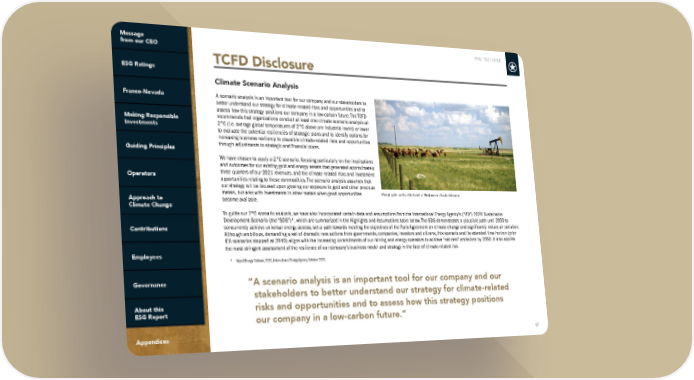 FNV: TSX | NYSE 97 TCFD Disclosure A scenario analysis is an important tool for our company and our stakeholders to better understand our strategy for climate-related risks and opportunities and to assess how this strategy positions our company in a low-carbon future. The TCFD recommends that organizations conduct at least one climate scenario analysis at 2°C (i.e. average global temperatures of 2°C above pre-industrial levels) or lower to evaluate the potential resiliencies of strategic plans and to identify options for increasing business resiliency to plausible climate-related risks and opportunities through adjustments to strategic and financial plans. We have chosen to apply a 2°C scenario, focusing particularly on the implications and outcomes for our existing gold and energy assets that generated approximately three-quarters of our 2021 revenues, and the climate-related risks and investment opportunities relating to these commodities. The scenario analysis assumes that our strategy will be focused upon growing our exposure to gold and other precious metals, but also with investments in other metals when good opportunities become available. To guide our 2°C scenario analysis, we have also incorporated certain data and assumptions from the International Energy Agency’s (“IEA”) 2020 Sustainable Development Scenario (the “SDS”)*, which are summarized in the Highlights and Assumptions table below. The SDS demonstrates a plausible path until 2050 to concurrently achieve universal energy access, set a path towards meeting the objectives of the Paris Agreement on climate change and significantly reduce air pollution. Although ambitious, demanding a set of dramatic new actions from governments, companies, investors and citizens, this scenario and its extended time horizon (prior IEA scenarios stopped at 2040) aligns with the increasing commitments of our mining and energy operators to achieve “net-zero” emissions by 2050. It also applies the most stringent assessment of the resilience of our company’s business model and strategy in the face of climate-related risk. Climate Scenario Analysis * World Energy Outlook, 2020, International Energy Agency, October 2020. Pump jack and cattle herd at Weyburn in Saskatchewan “A scenario analysis is an important tool for our company and our stakeholders to better understand our strategy for climate-related risks and opportunities and to assess how this strategy positions our company in a low-carbon future.”