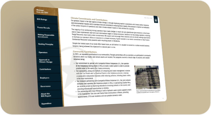 FNV: TSX | NYSE 4 Climate Commitments and Contributions. Our greatest impact in the fight against climate change, is through deploying capital to operations with limited carbon footprints and environmental impacts and to operators that are committed to reducing those impacts. We continue to improve our evaluation of the carbon footprint of operations and other climate-related impacts to best achieve this outcome. The majority of our producing mining operators have made pledges to reach net-zero greenhouse gas emissions in the future and/or have implemented near-term and intermediate targets to reduce emissions. Several of our key energy operators, including Range Resources, have made similar commitments. We support and encourage these initiatives and are actively seeking opportunities to facilitate our operators’ efforts to transition to a cleaner economy. A good example is our recent commitment to help finance Continental Resources’ solar-powered water recycling project in Oklahoma. Despite the limited scale of our small office based team, we still believe it is valuable to commit to a carbon neutral business footprint, having achieved this objective for a second year in a row. Community Contributions. In 2021, we expanded contributions to our communities. Through partnerships with our operators, we participated in community initiatives where our royalty and stream assets are located. The programs covered a broad range of projects with notable initiatives being: • Our commitment to partner with Compañía Miñera Antapaccay S.A., the operator at the Antapaccay mining project in Peru, to build a water system in order to provide potable water to the nearby Alto Huarca community. • Our sponsorship, along with SolGold, of a recycling and waste management initiative with the Lita Parish and La Carolina Parish in the Imbabura province, creating a sustainable independent business while reducing pollution, including plastic waste, in the local environment. • Our renewed partnership with Compañía Miñera Antamina S.A., the joint venture company that operates the Antamina project in Peru, in sponsoring Enseña Peru, an initiative aimed at improving education at existing schools in the country and providing educational opportunities to children. • Our partnership with Coeur Mining to build a hydraulic water system upgrade project in the Guazapares’ San Jose and Santa Clara communities in Mexico, providing approximately 270 local residents with non-potable domestic water. Plaque commemorating our partnership with Coeur Mining to provide non-potable water in Guazapares, Chihuahua