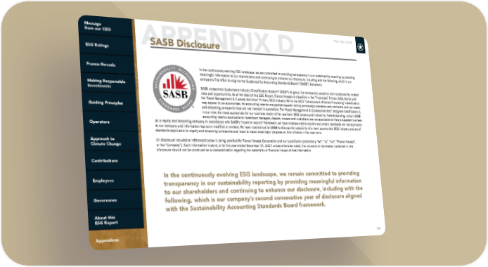 FNV: TSX | NYSE 104 APPENDIX D SASB Disclosure In the continuously evolving ESG landscape, we remain committed to providing transparency in our sustainability reporting by providing meaningful information to our shareholders and continuing to enhance our disclosure, including with the following, which is our company’s second consecutive year of disclosure aligned with the Sustainability Accounting Standards Board framework. In the continuously evolving ESG landscape, we are committed to providing transparency in our sustainability reporting by providing meaningful information to our shareholders and continuing to enhance our disclosure, including with the following, which is our company’s first effort to align to the Sustainability Accounting Standards Board (“SASB”) framework. SASB created the Sustainable Industry Classification System® (SICS®) to group like companies based on their sustainability-related risks and opportunities. As of the date of this ESG Report, Franco-Nevada is classified in the “Financials” Primary SICS Sector and the “Asset Management & Custody Activities” Primary SICS Industry. While the SICS “Extractives & Minerals Processing” classification may appear to be appropriate, its accounting metrics are geared towards mining and energy operators and producers and not royalty and streaming companies that are not involved in operations. The “Asset Management & Custody Activities” assigned classification is, in our view, the most appropriate for our business model of the available SICS sectors and industries. Notwithstanding, certain SASB accounting metrics applicable to investment managers, dealers, brokers and custodians are not applicable to Franco-Nevada’s business as a royalty and streaming company. In accordance with SASB’s “report or explain” framework, we have endeavoured to explain why certain standards are not applicable to our company and information has been modified or omitted. We have reached out to SASB to discuss the possibility of a more appropriate SICS industry and set of standards applicable to royalty and streaming companies and hope to make meaningful progress on this initiative in the near term. All disclosure included or referenced below is being provided for Franco-Nevada Corporation and our subsidiaries (collectively, “we”, “us”, “our”, “Franco-Nevada”, or the “Company”). Such information is as of, or for the year-ended December 31, 2021 unless otherwise noted. The inclusion of information contained in this disclosure should not be construed as a characterization regarding the materiality or financial impact of that information.