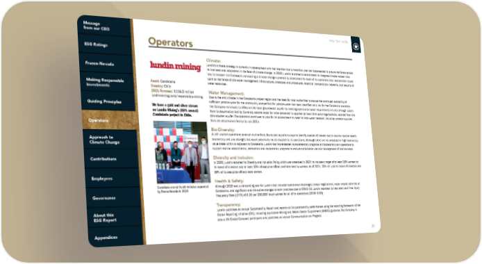 FNV: TSX | NYSE 20 Operators Climate: Lundin’s climate strategy is currently in development with the intention that a transition plan be implemented to ensure resilience across its business and adaptation in the face of climate change. In 2020, Lundin launched a commitment to integrate climate-related risks into its broader risk framework, conducting a climate change vulnerability assessment for each of its operations that incorporated issues such as resilience of site water management infrastructure, processes and procedures, essential transportation networks, and security of water resources. Water Management: Due to the arid climate in the Candelaria project region and the need for local authorities to ensure the continued availability of sufficient potable water for the community, competition for potable water has been identified as a risk for the Candelaria operation. The Company minimizes its effect on the local groundwater aquifer by meeting operational water requirements entirely through supply from its desalination facility. Currently, potable water for mine personnel is supplied by local third-party organizations, sourced from the groundwater aquifer. The operation continues to plan for its commitment to meet its total water demand, including potable supplies, from the desalination facility by July 2025. Bio-Diversity: All of Lundin’s operations conduct routine flora, fauna and aquatic surveys to identify species of interest and to monitor habitat health, biodiversity and any changes that could potentially be attributable to its operations. Although there are no protected or high biodiversity value areas within or adjacent to Candelaria, Lundin has implemented complementary programs at Candelaria’s port operations to support marine rehabilitation, restoration and replantation programs to ensure sustainable use and management of marine areas. Diversity and Inclusion: In 2020, Lundin adopted its Diversity and Inclusion Policy, which was amended in 2021 to include a target of at least 30% women on its board of directors and at least 30% of executive officer positions held by women. As of 2021, 33% of Lundin’s board of directors and 36% of its executive officers were women. Health & Safety: Although 2020 was a demanding year for Lundin that included operational challenges, labour negotiations, major project activities at Candelaria, and significant and disruptive changes to work practices due to COVID-19, Lundin recorded its best ever Lost Time Injury Frequency Rate (LTIFR) of 0.26 per 200,000 hours worked for all of its operations (2019: 0.40). Transparency: Lundin publishes an annual Sustainability Report and reports on its sustainability performance using the reporting framework of the Global Reporting Initiative (GRI), including applicable Mining and Metals Sector Supplement (MMSS) guidance. The Company is also a UN Global Compact participant and publishes an annual Communication-on-Progress. Asset: Candelaria Country: Chile 2021 Revenue: $116.5 million lundinmining.com/responsible-mining We have a gold and silver stream on Lundin Mining’s (80% owned) Candelaria project in Chile. Candelaria mental health initiative supported by Franco-Nevada in 2020
