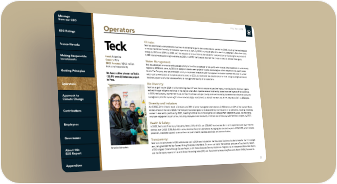 FNV: TSX | NYSE 22 Operators Asset: Antamina Country: Peru 2021 Revenue: $94.1 million teck.com/responsibility We have a silver stream on Teck’s (22.5% owned) Antamina project in Peru. Climate: Teck has established a comprehensive road map to achieving its goal to be a carbon neutral operator by 2050, including intermediate goals to reduce the carbon intensity of its overall operations by 33% by 2030, to procure 50% of its electricity demands in Chile from clean energy by 2025 and 100% by 2030, and the adoption of zero-emissions alternatives for transportation by displacing the equivalent of 1,000 internal combustion engine vehicles by 2025. In 2020, the Company reported that it was on track to achieve these goals. Water Management: Teck has developed a company-wide strategic priority to transition to seawater or low-quality water sources for all operations in water-scarce regions by 2040 and plans, by 2025, to design all development projects in water-scarce regions with a seawater or low-quality water source. The Company also has a strategic priority to implement innovative water management and water treatment solutions to protect water quality downstream of its operations and plans, by 2025, to implement new source control or mine design strategies and water treatment systems to further advance efforts to manage water quality at its operations. Bio-Diversity: Teck has a goal that by 2025 all of its operating sites will have plans to secure net positive impact, meaning that the biodiversity gains realized through mitigation activities in the regions where Teck operates exceed biodiversity losses from the impacts of its operations. In 2020, the Company reported that it was on track to achieve such goal, having continued advancing implementation of existing biodiversity management plans for operating sites and conducted gap assessments to identify key work that will be required to fulfill its 2025 goal. Diversity and Inclusion: As of 2020, 25% of Teck’s board of directors and 20% of senior management were women. 2,068 women, or 20% of the total workforce, worked at Teck at the end of 2020. The Company has several goals to increase diversity and inclusion at its operations, including increasing women in leadership positions by 2025, investing $200 million in training and skills development programs by 2025, and expanding employee engagement opportunities, including employee-driven community initiatives and a Company-wide feedback program, by 2025. Health & Safety: In 2020, Teck’s Lost Time Injury Frequency Rate (LTIFR) of 0.31 per 200,000 hours worked for all of its operations was lower than the previous year (2019: 0.38). Teck has a comprehensive five-pillar approach to managing the risks and impacts of COVID-19, which includes prevention, employee support, communities and public health, business continuity and communication. Transparency: Teck is an industry leader in ESG performance and in 2020 was included on the Dow Jones Sustainability World Index for the 11th straight year, being awarded the Top-Ranked Mining Company in the World. On an annual basis, the Company produces a Sustainability Report, a TCFD-aligned Climate Change Outlook Report, a UN Global Compact Communication-on-Progress and an Independent Assurance Report, and the Company reports in line with Global Reporting Index (GRI) and Sustainability Accounting Standards Board (SASB) frameworks. Antamina lab workers