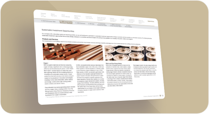 Franco-Nevada Corporation 58 As a company with a diversified royalty and streaming portfolio, we are well positioned to participate in sustainable investment opportunities arising in connection with the transition to a low-carbon economy. The following describes sustainable investment opportunities that we have already embraced in our portfolio and that we expect will continue to be available to our company in the short, medium and long-term. Products and Services Our investments in commodities used for low emission products and services may increase revenues and bring competitive advantage due to the increased demand from shifting consumer preferences. Copper: With its superior electrical and thermal conductivity, copper will play a significant role in enhancing energy efficiency and decarbonizing the planet. A 2017 World Bank report* counted dozens of metals that could see a growing market with the increasing reliance on renewable and sustainable energy sources. Copper ranked first (tied with aluminum and nickel) among all metals for its prevalence in low-carbon technologies, including in wind, solar photovoltaic, carbon capture and storage, nuclear power, light emitting diodes, electric vehicles and electric motors. Franco-Nevada’s top revenue generating stream interests are from copper mines, including certain of our Top Mining Assets (Cobre Panamá, Antapaccay, Antamina and Candelaria) where we receive precious metal by-products from copper concentrates. In 2021, we acquired another precious metal stream from the Condestable copper mine in Peru and, in 2022 and 2023, acquired, in several acquisitions, an effective royalty on the Caserones copper-molybdenum mine in Chile. Most recently, in 2024, we acquired a gold stream with reference to the Cascabel copper-gold development project located in Ecuador. Strong demand for copper increases the prospects of greater production from these operations. We also have royalties on a number of prospective copper development projects, including Copper World (Hudbay), Cascabel (SolGold), Taca Taca (First Quantum) and NuevaUnión (Teck and Newmont). We expect that in the future there will be further opportunities for our company to fund copper operations, to receive interests in copper and/or precious metal by-products. Nickel and Clean Energy Metals: While most of the global demand for nickel is for the production of stainless steel, nickel sulphate, a highly purified nickel compound that helps achieve higher energy density in lithium-ion batteries, extending the driving range of electric vehicles, is expected to become the second largest application for nickel by 2030. Our company has royalties on nickel projects, including the Mt. Keith nickel mine in Australia, Eagle’s Nest deposit in the Ring of Fire in Ontario, Canada and the Crawford nickel-cobalt project in Ontario, Canada. These projects are poised to benefit from the increasing demand for nickel and we may see more opportunities to fund nickel and other battery metal projects. Technologies involved in the clean energy transition are emerging and advancing rapidly through innovation and increased deployment. Over the past several years, our company has evaluated cobalt, lithium, rare earth, uranium and other battery metal and clean energy opportunities. Our technical and geological skill set positions us well to evaluate opportunities in all of these areas. * “The Growing Role of Minerals and Metals for a Low-carbon Future”, World Bank Group, June 2017. Sustainable Investment Opportunities Message from our CEO Report Highlights About Franco-Nevada Responsible Capital Allocation Community Contributions Good Governance and Shareholder Alignment Diversity, Inclusion and Well-Being Climate Action Transparency and Guiding Principles About this Sustainability Report Appendices Appendices A: ESG Performance Table B: ISSB Sustainability Disclosure Standards C: SASB Disclosure D: GRI Index E: Sustainable Development Goals F: KPMG: Independent Limited Assurance Report G: Carbon Neutral Initiative