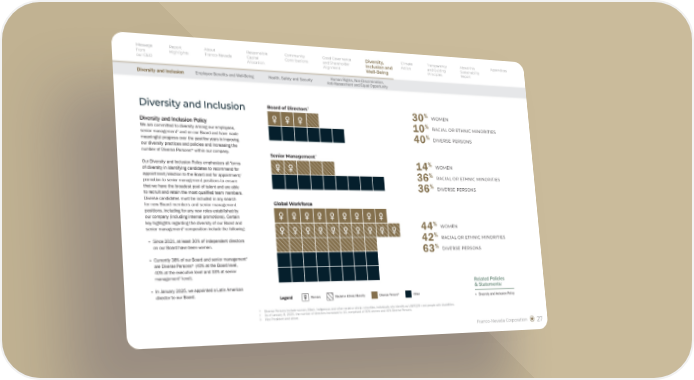 Franco-Nevada Corporation 27 Diversity and Inclusion Policy We are committed to diversity among our employees, senior management◊ and on our Board and have made meaningful progress over the past few years in improving our diversity practices and policies and increasing the number of Diverse Persons* within our company. Our Diversity and Inclusion Policy emphasizes all forms of diversity in identifying candidates to recommend for appointment/election to the Board and for appointment/ promotion to senior management positions to ensure that we have the broadest pool of talent and are able to recruit and retain the most qualified team members. Diverse candidates must be included in any search for new Board members and senior management positions, including for any new roles established by our company (including internal promotions). Certain key highlights regarding the diversity of our Board and senior management◊ composition include the following: § Since 2021, at least 30% of independent directors on our Board have been women. § Currently 38% of our Board and senior management◊ are Diverse Persons* (40% at the Board level, 40% at the executive level and 33% at senior management◊ level). § In January 2025, we appointed a Latin American director to our Board. Diversity and Inclusion * Diverse Persons include women, Black, Indigenous and other racial or ethnic minorities, individuals who identify as LGBTQ2S+ and people with disabilities. † As of January 8, 2025, the number of directors increased to 10, comprised of 30% women and 40% Diverse Persons. ◊ Vice President and above. Legend Woman Diverse Person* Racial or Ethnic Minority ♀ Other Senior Management◊ ♀ ♀ Board of Directors† ♀ ♀ ♀ WOMEN WOMEN WOMEN DIVERSE PERSONS DIVERSE PERSONS DIVERSE PERSONS RACIAL OR ETHNIC MINORITIES RACIAL OR ETHNIC MINORITIES RACIAL OR ETHNIC MINORITIES 30% 10% 14% 44% 36% 42% 40% 36% 63% Related Policies & Statements: § Diversity and Inclusion Policy Global Workforce ♀ ♀ ♀ ♀ ♀ ♀ ♀ ♀ ♀ ♀ ♀ ♀ ♀ ♀ ♀ ♀ ♀ ♀ ♀ Message from our CEO Report Highlights About Franco-Nevada Responsible Capital Allocation Community Contributions Good Governance and Shareholder Alignment Climate Action Transparency and Guiding Principles About this Sustainability Report Appendices Diversity, Inclusion and Well-Being Employee Benefits and Well-Being Health, Safety and Security Human Rights, Non-Discrimination, Anti-Harassment and Equal Opportunity Diversity and Inclusion