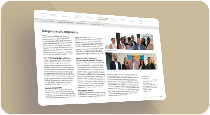 Franco-Nevada upholds strong governance with robust policies, annual training, and zero complaints to date—ensuring ethics, integrity, and compliance.