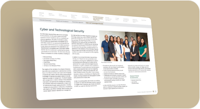 Franco-Nevada Corporation 25 Our Information Security Policy sets out our principles for the protection of information assets and proper controls to ensure compliance with our standards and external regulations. The policy is intended to define the principles and requirements of acceptable use of information assets for our personnel and describe how these will be implemented across our global operations. It also informs our personnel of our expectations and requirements for acceptable use of information assets and the role of our personnel in protecting the security and integrity of our information. The Information Security Policy is comprised of a number of policies, including our: § Password Policy § Acceptable Computer Use Policy § Removable Media Policy § Email Policy § Remote Access Policy § AI Tools in the Workplace Policy The majority of the members of our Board of Directors have skills and competencies in cybersecurity (currently, three of our Board members have expert level knowledge of cybersecurity matters, with five others having sufficient knowledge of cybersecurity-related matters to provide high-level oversight of management). The Board engages with management in matters relating to Franco-Nevada’s information and cybersecurity strategy and maintains the necessary skills and competencies in topics such as cybersecurity through ongoing education, including management presentations, conferences, consultations with experts, and offsite meetings. Board members also receive regular relevant materials from management. Our Audit and Risk Committee has general oversight over technology related risks, which includes cybersecurity and AI risk management, and oversees the Information Security Policy. Our Chief Financial Officer has been designated by the Audit and Risk Committee as the executive responsible for: establishing and maintaining the practices and procedures necessary to implement the Information Security Policy, providing training to our personnel on the substance of the Information Security Policy at least once annually, and reporting to the Audit and Risk Committee on the operation of and compliance with the policy. In addition to our annual Information Security Policy training, our IT Department also periodically sends newsletters to all personnel, highlighting key updates and developments affecting the company and its personnel from a cyber and technological security perspective. In 2024, employees also completed a comprehensive IT security awareness training program, which covered essential topics such as recognizing phishing attempts, creating strong passwords, and safely handling sensitive information. It also included interactive modules on identifying and mitigating cyber threats, ensuring employees are well-equipped to protect both personal and company data. In light of escalating global cyber threats, we continue to improve our cyber and information security measures to mitigate risks of potential cyber threats and attacks. In 2024, we made the following improvements: Cyber and Technological Security Related Policies & Statements: § Information Security Policy § Audit and Risk Committee Charter Franco-Nevada's Finance team § Strengthened cybersecurity risk management processes, with more frequent security updates to the Audit and Risk Committee; § Further enhanced password security, as part of a Zero Trust framework; § Updated and tested our disaster recovery plan; § Collaborated with third-party companies to assess risk and test our security and access controls; and § Conducted regular vulnerability assessments and penetration testing to identify and mitigate potential threats. In 2024, ISS ESG released a new Cyber Risk Score, which is a data-driven rating that provides visibility into the level of cyber readiness and resilience an organization has implemented based on its ongoing actions to identify, manage, and mitigate cyber risk across its external technology networks. Franco-Nevada currently scores 834 out of a maximum 850, indicating a low risk of a material cybersecurity breach. Message from our CEO Report Highlights About Franco-Nevada Responsible Capital Allocation Community Contributions Diversity, Inclusion and Well-Being Climate Action Transparency and Guiding Principles About this Sustainability Report Appendices Corporate Governance Good Governance and Shareholder Alignment Integrity and Compliance Shareholder Alignment Cyber and Technological Security