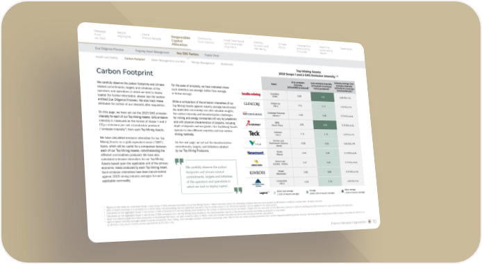 Franco-Nevada Corporation 10 1 Figures in this table are estimated Scope 1 and Scope 2 GHG emission intensities of our Top Mining Assets. Unless otherwise noted, the underlying emission data has been provided by MineSpans (outside-in modeled data - all rights reserved). 2 GHG emission intensity (i) is provided on a 100% basis, notwithstanding that the applicable operation may be jointly owned by the referenced operator, and (ii) applies to the entire project. 3 Calculated as the aggregate Scope 1 and Scope 2 GHG emissions from the Top Mining Asset divided by the number of GEOs produced by such asset. Copper, iron ore, and other commodities are converted to GEOs by dividing associated revenue for such commodity by the gold price. 4 Calculated as the aggregate Scope 1 and Scope 2 GHG emissions from the Top Mining Asset divided by the total production volume of the primary production (excluding by-products) of such asset. 5 Given the balanced gold and silver production at Guadalupe-Palmarejo, we have converted silver to GEOs, which are included with gold ounces in both emission intensity calculations. 6 GHG emission intensity averages apply to primary production from mining. Such averages exclude mid-stream processing, other than for iron ore, which includes production from certain integrated pelletizing plants. Sources: McKinsey global mining industry GHG emission intensities for 2023 for Cu (3.18 tCO2/t Cu), Au (0.73 tCO2/oz Au) and 62% Fe (0.02 tCO2/t Fe). Legend 6 Better than average (10% of industry average) We carefully observe the carbon footprints and climate- related commitments, targets and initiatives of the operators and operations in which we look to deploy capital (for further information, please see the section entitled Due Diligence Process). We also track these attributes for certain of our interests after acquisition. On this page, we have set out the 2023 GHG emission intensity for each of our Top Mining Assets. GHG emission intensity is measured as the tonnes of Scope 1 and 2 CO2e emissions per unit of production produced (“emission intensity”) from such Top Mining Assets. We have calculated emission intensities for our Top Mining Assets on a gold equivalent ounce (“GEO”) basis, which will be useful for a comparison between each of our Top Mining Assets, notwithstanding the different commodities produced. We have also calculated emission intensities for our Top Mining Assets based upon the applicable unit of the primary economic metal produced by each Top Mining Asset. Such emission intensities have been benchmarked against 2023 mining industry averages for each applicable commodity. For the sake of simplicity, we have indicated where such statistics are average, better than average, or below average. While a comparison of the emission intensities of our Top Mining Assets against industry average benchmarks (by applicable commodity) can offer valuable insights, the carbon intensity and decarbonization challenges for mining and energy companies will vary by jurisdiction and with physical characteristics of projects, including depth of deposits and ore grades. Our Top Mining Assets operate in nine different countries and use various mining methods. On the next page, we set out the decarbonization commitments, targets, and initiatives adopted by our Top Mining Producers. Carbon Footprint Top Mining Assets: 2023 Scope 1 and 2 GHG Emission Intensity 1, 2 Asset GHG emission intensity (tCO2e/GEO produced) 3 GHG emission intensity (tCO2e/unit of primary metal produced) 4 Industry average GHG emission intensity (tCO2e/unit of primary metal produced) 6 Candelaria (Chile) 0.83 4.02 3.18 tCO2/t Cu Antapaccay (Peru) 0.65 2.73 3.18 tCO2/t Cu Guadalupe-Palmarejo (Mexico) 5 0.46 0.46 0.73 tCO2/oz Au MWS (South Africa) 1.31 1.30 0.73 tCO2/oz Au Antamina (Peru) 0.31 1.78 3.18 tCO2/t Cu Northern and Southeastern Systems (Brazil) 0.33 0.01 0.02 tCO2/t Fe Subika (Ghana) 0.40 0.40 0.73 tCO2/oz Au Detour Lake (Canada - Ontario) 0.47 0.45 0.73 tCO2/oz Au Tasiast (Mauritania) 0.56 0.55 0.73 tCO2/oz Au Condestable (Peru) 0.18 1.04 3.18 tCO2/t Cu We carefully observe the carbon footprints and climate-related commitments, targets and initiatives of the operators and operations in which we look to deploy capital... Responsible Capital Allocation Due Diligence Process Ongoing Asset Management Key ESG Factors Supply Chain Message from our CEO Report Highlights About Franco-Nevada Community Contributions Good Governance and Shareholder Alignment Diversity, Inclusion and Well-Being Transparency and Guiding Principles Climate Action About this Sustainability Report Appendices Health and Safety Carbon Footprint Water Management and Risk Tailings Management Biodiversity