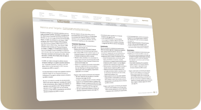 Franco-Nevada Corporation 63 Emissions relating to our corporate operations and our royalty and stream portfolio, calculated in accordance with the GHG Protocol Corporate Accounting and Reporting Standard, are set out on pages 35–40 in this Sustainability Report. In 2024, we produced no (nil) Scope 1 GHG emissions, 58.4 tCO2e of Scope 2 GHG emissions and 236.9 tCO2e of Scope 3 GHG emissions for an aggregate total of 295.3 tCO2e. Such Scope 3 GHG emissions total excludes any Financed Emissions (or Scope 3, Category 15 (Investments) emissions). Due to the delayed timing of availability of production and emissions data from operators, Financed Emissions have been calculated and disclosed for 2021, 2022 and 2023. Currently, the company does not apply an internal carbon price. In 2023, we made a new goal to achieve net-zero emissions relating to our global corporate operations (our “Corporate Emissions”) by 2050, in line with global efforts to limit warming to 1.5°C (“net-zero emissions by 2050 or sooner”). As described below we have since adopted emissions reduction targets for our Corporate Emissions in furtherance of our goal to achieve net-zero emissions by 2050 or sooner. We also committed to consider the decarbonization efforts and net-zero alignment, including with respect to the commitments, plans, targets and initiatives, of operators and operations when making investment decisions and to engage with new and existing partners on their efforts to decarbonize and achieve net-zero emissions by 2050 or sooner. We have adopted a Climate Action Policy, which is summarized below and formalizes our climate-related commitments and measures relating to corporate operations and our investment decisions, and other commitments regarding our other stakeholders. Corporate Operations We aspire to achieve net-zero Corporate Emissions by 2050. To reach this goal, we: § Measure and record our Corporate Emissions in accordance with the Greenhouse Gas Protocol; § Have adopted GHG emission reduction targets for our Corporate Emissions in line with the achievement of net-zero emissions by 2050 or sooner; § Maintain carbon neutrality on an annual basis for our Corporate Emissions by purchasing high quality carbon offsets for those Corporate Emissions that cannot be eliminated; and § Report on our progress and provide climate-related disclosures aligned with the recommendations from the Task Force for Climate-related Financial Disclosures (TCFD) and regulatory requirements applicable to our company. Progress made towards commitments and measures: § We have measured and recorded our Corporate Emissions (see pages 38–39); § In 2024, we adopted absolute emissions reduction targets for our Corporate Emissions, including a 42% reduction in Scope 2 emissions by 2030 and a 30% reduction in our overall Corporate Emissions by 2030, each from a 2023 base year (see page 34); § We have implemented initiatives to reduce our absolute Corporate Emissions (see page 37); § We achieved carbon neutrality for our Corporate Emissions (see page 39); and § In this Sustainability Report, we have reported on our progress, including in alignment with TCFD recommendations and our transition to disclosing in alignment with IFRS S1 and S2 in this Appendix. Investments We are committed to considering the decarbonization efforts and net-zero alignment of operators and operations when making investment decisions. We are also committed to engaging with new and existing partners on their efforts to decarbonize and achieve net-zero emissions by 2050 or sooner. To achieve this, we will: § Assess the decarbonization commitments, plans, targets and initiatives of operators, including commitments to or progress towards achieving net-zero emissions by 2050 or sooner in our due diligence processes when evaluating new opportunities; § Monitor operators’ decarbonization efforts and progress towards net-zero emissions by 2050 or sooner; § Measure and record Financed Emissions from our royalty and stream assets in accordance with the Greenhouse Gas Protocol and other leading supplementary guidance; and § Explore options on how we may assist operators’ energy transitions, climate-related community and other initiatives, and/or other activities aimed at decarbonization and achieving net-zero emissions by 2050 or sooner. Progress made towards commitments and measures: § Since the recent adoption of our Climate Action Policy, we have assessed the net-zero alignment of operators when evaluating new opportunities; § In this Sustainability Report, we have summarized the progress of our Top Mining Producers in achieving their decarbonization goals and net-zero ambitions (see page 11); § We have measured and recorded our Financed Emissions for 2021, 2022 and 2023 (see page 40); and § In 2023, we helped finance Continental Resources’ solar-powered water recycling project in Oklahoma. Stakeholders To further support an awareness of climate reduction goals, including net-zero emissions by 2050 or sooner, we: § Ensure that our external consultants are familiar with our support for the goal of decarbonization and net-zero emissions by 2050 or sooner and understand Franco-Nevada’s commitments under the Climate Action Policy; and § Ensure before transacting with any significant supplier of goods for our corporate operations, that such supplier is aligned with the goal of net-zero emissions by 2050 or sooner. Progress made towards commitments and measures: § Since the recent adoption of our Climate Action Policy, we have ensured that our consultants acknowledge familiarity with our net-zero goal and our Climate Action Policy commitments; and § We have ensured that our significant suppliers of goods for our corporate operations have commitments, plans, targets or initiatives aligned with net-zero (see page 16). Metrics and Targets | The metrics and targets used to assess, manage and monitor relevant sustainability- and climate-r
