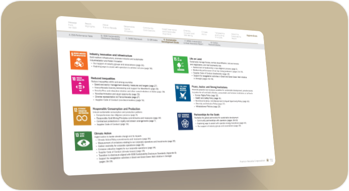 Franco-Nevada Corporation 72 Climate Action Urgent action to tackle climate change and its impacts § Climate Action Policy commitments and measures (page 34) § Measurement of emissions relating to our corporate operations and investments (page 35) § Carbon neutrality for corporate operations (page 39) § Emission reduction targets for our corporate operations (page 34) § Supplier Code of Conduct (climate issues) (page 16) § Transition to disclosure aligned with ISSB Sustainability Disclosure Standards (Appendix B) § Support for revegetation activities in Brazil and Great Green Wall initiative in Senegal (pages 18–19) Industry, Innovation and Infrastructure Build resilient infrastructure, promote inclusive and sustainable industrialization and foster innovation § Our support of industry groups and associations (page 20) § Exploring ways to assist with operators to achieve net-zero (page 34) Life on Land Sustainably manage forests, combat desertification, halt and reverse land degradation, and halt biodiversity loss § Assessment of biodiversity in due diligence process (page 5) § Biodiversity performance of our top mining producers (pages 14–15) § Supplier Code of Conduct (biodiversity) (page 16) § Support for revegetation activities in Brazil and Great Green Wall initiative in Senegal (pages 18–19) Reduced Inequalities Reduce inequalities within and among countries § Board and senior management diversity measures and targets (page 27) § Franco-Nevada Diversity Scholarship and support for BlackNorth (page 29) § Enseña Peru and education intiative and other social initiatives in Idaho (page 18) § Non-discrimination and equal opportunity (page 32) § Diverse representation at Franco-Nevada (page 27) § Supplier Code of Conduct (non-discrimination) (page 16) Responsible Consumption and Production Ensure sustainable consumption and production patterns § Comprehensive due diligence process (page 5) § Responsible Gold Mining Principles commitments and measures (page 44) § Contractual protections in royalty and stream arrangements (page 7) § Supplier Code of Conduct (page 16) Peace, Justice and Strong Institutions Promote peaceful and inclusive societies for sustainable development, provide access to justice for all and build effective, accountable and inclusive institutions at all levels § Human Rights Policy (page 32) § Health and Safety Policy (page 31) § Non-Discrimination, Anti-Harassment & Equal Opportunity Policy (page 32) § Diversity and Inclusion Policy (page 27) § Whistleblower Policies (page 23) Partnerships for the Goals Revitalize the global partnership for sustainable development § Community partnerships with operators (pages 18–19) § Exploring ways to assist with operator energy transitions (page 34) § Our support of industry groups and associations (page 20) Message from our CEO Report Highlights About Franco-Nevada Responsible Capital Allocation Community Contributions Good Governance and Shareholder Alignment Diversity, Inclusion and Well-Being Climate Action Transparency and Guiding Principles About this Sustainability Report Appendices Appendices A: ESG Performance Table B: ISSB Sustainability Disclosure Standards C: SASB Disclosure D: GRI Index E: Sustainable Development Goals F: KPMG: Independent Limited Assurance Report G: Carbon Neutral Initiative