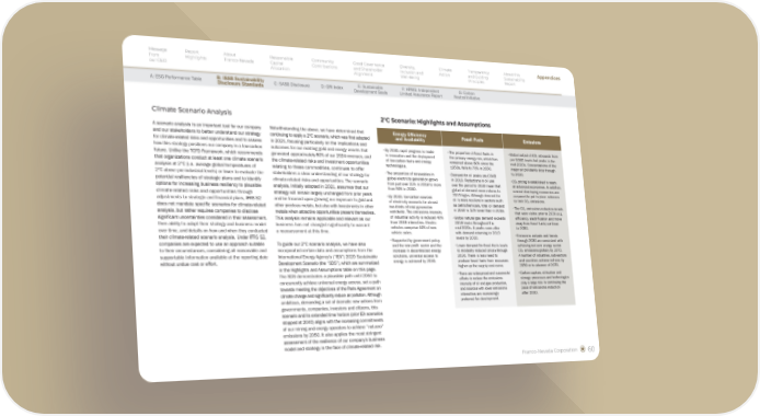 Franco-Nevada Corporation 60 A scenario analysis is an important tool for our company and our stakeholders to better understand our strategy for climate-related risks and opportunities and to assess how this strategy positions our company in a low-carbon future. Unlike the TCFD Framework, which recommends that organizations conduct at least one climate scenario analysis at 2°C (i.e. average global temperatures of 2°C above pre-industrial levels) or lower to evaluate the potential resiliencies of strategic plans and to identify options for increasing business resiliency to plausible climate-related risks and opportunities through adjustments to strategic and financial plans, IFRS S2 does not mandate specific scenarios for climate-related analysis, but rather requires companies to disclose significant uncertainties considered in their assessment, their ability to adapt their strategy and business model over time, and details on how and when they conducted their climate-related scenario analysis. Under IFRS S2, companies are expected to use an approach suitable to their circumstances, considering all reasonable and supportable information available at the reporting date without undue cost or effort. Notwithstanding the above, we have determined that continuing to apply a 2°C scenario, which was first adopted in 2021, focusing particularly on the implications and outcomes for our existing gold and energy assets that generated approximately 80% of our 2024 revenues, and the climate-related risks and investment opportunities relating to these commodities, continues to offer stakeholders a clear understanding of our strategy for climate-related risks and opportunities. The scenario analysis, initially adopted in 2021, assumes that our strategy will remain largely unchanged from prior years and be focused upon growing our exposure to gold and other precious metals, but also with investments in other metals when attractive opportunities present themselves. This analysis remains applicable and relevant as our business has not changed significantly to warrant a reassessment at this time. To guide our 2°C scenario analysis, we have also incorporated certain data and assumptions from the International Energy Agency’s (“IEA”) 2020 Sustainable Development Scenario (the “SDS”), which are summarized in the Highlights and Assumptions table on this page. The SDS demonstrates a plausible path until 2050 to concurrently achieve universal energy access, set a path towards meeting the objectives of the Paris Agreement on climate change and significantly reduce air pollution. Although ambitious, demanding a set of dramatic new actions from governments, companies, investors and citizens, this scenario and its extended time horizon (prior IEA scenarios stopped at 2040) aligns with the increasing commitments of our mining and energy operators to achieve “net-zero” emissions by 2050. It also applies the most stringent assessment of the resilience of our company’s business model and strategy in the face of climate-related risk. 2°C Scenario: Highlights and Assumptions Energy Efficiency and Availability Fossil Fuels Emissions • By 2030, rapid progress is made in innovation and the deployment of low-carbon fuels and energy technologies. • The proportion of renewables in global electricity generation grows from just over 25% in 2019 to more than 50% in 2030. • By 2030, low-carbon sources of electricity accounts for almost two-thirds of total generation worldwide. The emissions intensity of industrial activity is reduced 40% from 2019 intensities. Electric vehicles comprise 40% of new vehicle sales. • Supported by government policy and the non-profit sector and the increase in decentralized energy solutions, universal access to energy is achieved by 2030. • The proportion of fossil fuels in the primary energy mix, which has remained above 80% since the 1950s, falls to 70% in 2030. • Demand for oil peaks pre-COVID in 2019. Reductions in oil use over the period to 2030 mean that global oil demand never returns to 2019 highs. Although demand for oil is more resilient in sectors such as petrochemicals, total oil demand in 2030 is 12% lower than in 2019. • Global natural gas demand exceeds 2019 levels throughout the mid-2020s. It peaks soon after with demand returning to 2019 levels by 2030. • Lower demand for fossil fuels leads to modestly reduced prices through 2030. There is less need to produce fossil fuels from resources higher up the supply cost curve. • There are widespread and successful efforts to reduce the emissions intensity of oil and gas production, and sources with lower emissions intensities are increasingly preferred for development. • Global output of CO2 rebounds from pre-COVID levels but peaks in the mid-2020s. Concentrations of the major air pollutants drop through to 2030. • CO2 pricing is established in nearly all advanced economies. In addition, several developing economies are assumed to put in place schemes to limit CO2 emissions. • The CO2 emissions reduction trends that were visible prior to 2030 (e.g. efficiency, electrification and move away from fossil fuels) continue to 2050. • Emissions outputs and trends through 2030 are consistent with achieving net-zero energy sector CO2 emissions globally by 2070. A number of industries, sub-sectors and countries achieve net-zero by 2050 or in advance of 2070. • Carbon capture, utilisation and storage processes and technologies play a large role in continuing the pace of emissions reduction after 2030. Climate Scenario Analysis Message from our CEO Report Highlights About Franco-Nevada Responsible Capital Allocation Community Contributions Good Governance and Shareholder Alignment Diversity, Inclusion and Well-Being Climate Action Transparency and Guiding Principles About this Sustainability Report Appendices Appendices A: ESG Performance Table B: ISSB Sustainability Disclosure Standards C: SASB Disclosure 
