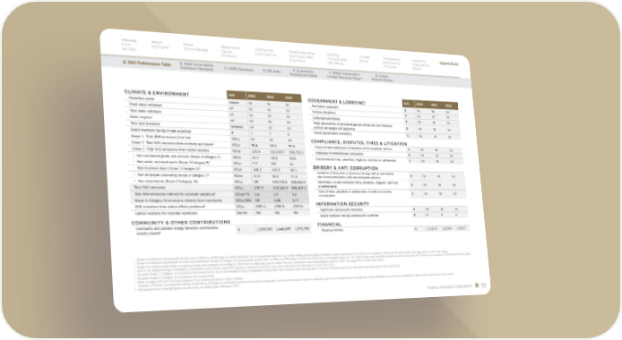Franco-Nevada Corporation 50 1 Scope 2 emissions were grossed up last year to 100% on a FTE-basis for 2022 and 2023 due to unavailable data from our United States and Australian operations, which accounted for 17.5% of our company for 2023 and 12.5% for 2022. See page 38 for further information. 2 Scope 3 emissions (attributable to waste and wastewater (Scope 3 Category 5)) were grossed up last year to 100% on a FTE-basis for 2022 and 2023 due to unavailable data from our United States and Australian operations, which accounted for 17.5% of our company for 2023 and 12.5% for 2022. 3 Scope 3 emissions attributable to business travel and employee commuting for 2022 were restated last year to reflect the new calculations and methodologies used for 2023. See page 39 for further information. 4 Due to the delayed timing of availability of production and emission data from operators, financed emissions have been calculated and disclosed for 2022 and 2023. 5 Excludes Scope 3, Category 15 emissions from investments. Due to the delayed timing of availability of production and emission data from operators, financed emissions have been calculated and disclosed for 2022 and 2023. 6 Excludes Scope 3, Category 15 emissions from investments. 7 Refer to pages 39 and 74 for descriptions of our annual purchase of carbon offsets. 8 Inclusive of industry and diversity-related contributions. Excludes (i) charitable donations by company employees, and (ii) commitments made in a calendar year but not funded. Franco-Nevada has made additional commitments exceeding $2 million, which have not yet been funded. 9 All Government & Lobbying figures are Nil since our initial public offering in 2007. CLIMATE & ENVIRONMENT Unit 2024 2023 2022 Hazardous waste tonnes Nil Nil Nil Fresh water withdrawn m3 Nil Nil Nil Total water withdrawn m3 Nil Nil Nil Water recycled m3 Nil Nil Nil Total land disturbed hectares Nil Nil Nil Board members having climate expertise # 7 7 6 Scope 1 - Total GHG emissions from fuel tCO2e Nil Nil Nil Scope 2 - Total GHG emissions from electricity and steam1 tCO2e 58.4 63.9 57.6 Scope 3 - Total GHG emissions from indirect sources tCO2e 236.9 615,878.7 558,750.3 • from purchased goods and services (Scope 3 Category 1) tCO2e 22.7 26.3 20.6 • from waste and wastewater (Scope 3 Category 5)2 tCO2e 7.7 5.6 4.1 • from business travel (Scope 3 Category 6)3 tCO2e 188.9 100.6 68.3 • from employee commuting (Scope 3 Category 7)3 tCO2e 17.6 18.2 17.3 • from investments (Scope 3 Category 15) tCO2e NR4 615,728.0 558,640.0 Total GHG emissions tCO2e 295.35 615,942.6 558,807.9 Total GHG emissions intensity for corporate operations6 tCO2e/FTE 6.9 5.4 4.2 Scope 3, Category 15 emissions intensity from investments tCO2e/GEO NR4 0.98 0.77 GHG reductions from carbon offsets purchased7 tCO2e (369.1) (268.3) (209.9) Carbon neutrality for corporate operations Yes/No Yes Yes Yes COMMUNITY & OTHER CONTRIBUTIONS Community and operator energy transition contributions actually funded8 $ 1,636,936 1,448,065 1,070,785 GOVERNMENT & LOBBYING9 Unit 2024 2023 2022 Facilitation payments $ Nil Nil Nil Political donations $ Nil Nil Nil Lobbying expenditures $ Nil Nil Nil Trade associations or tax-exempt groups whose role is to influence political campaigns and legislation $ Nil Nil Nil Known government ownership % Nil Nil Nil COMPLIANCE, DISPUTES, FINES & LITIGATION Cases of non-compliance or breaches of our corporate policies # Nil Nil Nil Instances of whistleblower complaints # Nil Nil Nil Environmental fines, penalties, litigation, liabilities or settlements # Nil Nil Nil BRIBERY & ANTI-CORRUPTION Incidents of discipline or dismissal among staff or consultants due to non-compliance with anti-corruption policies # Nil Nil Nil Anti-bribery, or anti-corruption fines, penalties, litigation, liabilities or settlements # Nil Nil Nil Cost of fines, penalties or settlements in relation to bribery or corruption $ Nil Nil Nil INFORMATION SECURITY Significant cybersecurity breaches # Nil Nil Nil Board members having cybersecurity expertise # 8 8 6 FINANCIAL Revenue (million) $ 1,113.6 1,219.0 1,315.7 Message from our CEO Report Highlights About Franco-Nevada Responsible Capital Allocation Community Contributions Good Governance and Shareholder Alignment Diversity, Inclusion and Well-Being Climate Action Transparency and Guiding Principles About this Sustainability Report Appendices Appendices A: ESG Performance Table B: ISSB Sustainability Disclosure Standards C: SASB Disclosure E: Sustainable Development Goals F: KPMG: Independent Limited Assurance Report G: Carbon Neutral Initiative D: GRI Index