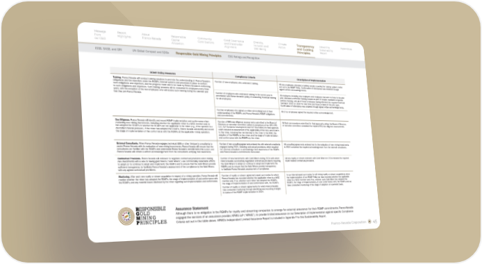 Franco-Nevada Corporation 45 RGMP Policy Measures Compliance Criteria Description of Implementation Training. Franco-Nevada will conduct training sessions to promote the understanding of: Franco-Nevada’s obligations and the objectives under the RGMPs, internal systems and processes in place to conform such obligations and objectives, and the progress made and to be made by Franco-Nevada in conforming to such obligations and objectives. Such training sessions will be conducted for employees every three years, with the exception of the new employees who will receive such training during the calendar year that they join Franco-Nevada. Number of new employees who underwent training. All new employees attended a training session covering the training subject matter set out in the RGMP Policy. Confirmation of attendance was obtained through signed written acknowledgements. Number of employees who underwent training in the current year in accordance with Franco-Nevada’s policy of conducting tri-annual training for all employees. All employees, including new employees and employees that were on leave in the prior year, attended a refresher training module as part of broader mandated corporate policies training, with all of these employees having attended the required tri-annual training in 2023 (or 2024 for new hires and those on leave in the prior year). Confirmation of attendance was obtained through signed written acknowledgements. Number employees who signed a written acknowledgment of their understanding of the RGMPs and Franco-Nevada’s RGMP obligations and commitments. All of our employees signed the required written acknowledgement. Due Diligence. Franco-Nevada will identify and record RGMP implementation and conformance when evaluating new mining investments, including whether the applicable miner is a WGC member and/or has adopted the RGMPs or whether the RGMPs are not applicable to the miner (e.g., if the operator is a diversified mineral producer). If the miner has adopted the RGMPs, Franco-Nevada will identify and record the stage of implementation of the conformance with the RGMPs at the applicable mining operation. Number of ESG due diligence assessments submitted to the Board of Directors or executive committee (which is comprised of the CEO, CFO, CLO, SVP Business Development and SVP Diversified) for final approval, which included an assessment of the applicability of the WGC and RGMPs to the miner, including the membership by the miner in the WGC, the adoption of the RGMPs by the miner, and the stage of implementation and conformance with the RGMPs by the miner. All final memorandums submitted for final approval to either the Board of Directors or executive committee contained the required ESG due diligence assessments. External Consultants. When Franco-Nevada engages technical, ESG or other third-party consultants to assist Franco-Nevada with its evaluation of new mining investments, Franco-Nevada will ensure that the consultants are familiar with the RGMPs and understand Franco-Nevada’s commitments thereunder and Franco-Nevada will obtain a written acknowledgement from the consultants verifying their awareness. Number of new consulting agreements entered into with external consultants engaged during 2024, including contractual provisions which required the external consultant to acknowledge their awareness of the RGMPs and Franco-Nevada’s commitments thereunder. All consulting agreements entered into for the evaluation of new mining investments in 2024 contained the required acknowledgement from the external consultants. Contractual Provisions. Franco-Nevada will endeavor to negotiate contractual provisions when making new investments with a view to having gold miners (“Gold Miners”) use commercially reasonable efforts to adopt (or to continue to adopt and implement) the RGMPs and to ensure that the Gold Miners provide sufficient transparency to facilitate Franco-Nevada’s assessment of the compliance by the Gold Miners with any agreed contractual provisions. Number of new investments with Gold Miners during 2024 with whom Franco-Nevada successfully negotiated contractual provisions requiring the Gold Miners to adopt (or continue to adopt and implement) the RGMPs and to ensure that the Gold Miners provide transparency to facilitate Franco-Nevada’s assessment of compliance. All new royalty or stream contracts with Gold Miners in 2024 included the required RGMP-related contractual provisions. Monitoring. After each new royalty or stream acquisition in respect of a mining operation, Franco-Nevada will monitor whether the miner has adopted the RGMPs, the stage of implementation of and conformance with the RGMPs, and any material issues disclosed by the miner regarding such implementation and conformance. Number of royalty or stream agreement asset summaries for which Franco-Nevada has recorded whether the applicable miner is a WGC member and, if so, whether such miner has adopted the RGMPs, the stage of implementation of and conformance with, the RGMPs. Number of royalty or stream agreements for which Franco-Nevada has conducted monitoring through identifying and recording changes in status of the RGMP implementation in 2024. In our internal asset summaries for all mining royalty or stream acquisitions since the implementation of our RGMP Policy we have recorded whether the applicable miner is a WGC member and, if so, whether such Gold Miner has adopted the RGMPs, the stage of implementation of, and conformance with, the RGMPs and we have conducted monitoring of the stage of adoption on a periodic basis. Assurance Statement Although there is no obligation in the RGMPs for royalty and streaming companies to arrange for external assurance for their RGMP commitments, Franco-Nevada engaged the services of an assurance provider, KPMG LLP (“KPMG”), to provide limited assurance on our Description of Implementation against specific Compliance Criteria set out in the t