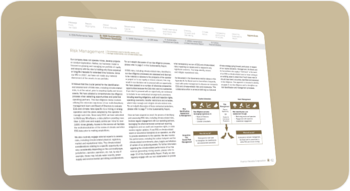 Franco-Nevada Corporation 62 Our company does not operate mines, develop projects or conduct exploration. Rather, our business model is focused on growing and managing our portfolio of royalty and streams with the view to holding onto these perpetual or long-life interests for extended time horizons. Since our IPO in 2007, we have not made any material divestment of the assets in our portfolio. It follows that the crucial period for the identification and assessment of ESG risks, including climate-related risks, is at the outset, prior to acquiring royalty and stream assets. We have adopted a comprehensive due diligence process when selecting opportunities and potential operating partners. This due diligence review involves utilizing the extensive experience of our multi-disciplinary management team and Board of Directors to evaluate ESG and climate risks specific to a mining or energy operation and the plans adopted by the operator to manage such risks. Since early 2022, we have subscribed to McKinsey MineSpans, a data platform providing more than 1,000 cost and supply points per mine for over 3,800 mines globally. Access to this service will facilitate the institutionalization of the review of climate and other ESG data prior to making acquisitions. We also routinely engage external experts to assess risks, including climate-related physical, regulatory, market and reputational risks. The climate-related considerations relating to a specific opportunity will vary considerably depending on the commodity-type, jurisdiction, operator, operation, etc. but, by way of example, these may include water scarcity, power supply and environmental permitting considerations. For an in-depth discussion of our due diligence process, please refer to page 5 in this Sustainability Report. If ESG risks, including climate-related risks, identified in our due diligence processes are assessed and deemed to be material or adverse to the prospects of the operator or project or to our royalty or stream interest, this may result in our decision not to proceed with an opportunity. We have passed on a number of otherwise prospective opportunities because the ESG risks were too substantial. If we elect to proceed with an opportunity, we endeavour to include in our contractual arrangements provisions including reporting obligations, audit and inspection rights, operating covenants, transfer restrictions and remedies, which help manage and mitigate climate-related risks. For an in-depth discussion of these contractual protections, please refer to page 7 in this Sustainability Report. Once we have acquired an asset, the process of identifying and assessing ESG risks, including climate-related risks, involves regular engagement with our operating partners, leveraging the aforementioned contractual reporting obligations and our audit and inspection rights, in order receive regular updates. If any ESG or climate-related event or occurrence transpires at an operation, we offer to provide assistance to the operator. We also monitor the performance, including the carbon footprint and the climate-related commitments, plans, targets and initiatives of certain of our producing assets. For further information regarding the climate-related performance of our top revenue generating mining assets, please refer to page 10 of this Sustainability Report. Finally, we also regularly engage with our own stakeholders to provide what transparency we can of ESG and climate-related risks impacting our assets and to respond to any significant concerns. This helps identify, assess and mitigate reputational risks. As discussed in the Governance section above in this Appendix B, the Board and its Committees frequently meet with senior management to discuss our company’s ESG and climate-related risks and exposures. This collaborative effort is aimed at defining our ESG and climate strategy going forward, particularly in respect of our capital allocation. Management, the Board and its Committees also apply a “look-back” in the event of an ESG or climate-related event or issue arising at an existing asset to determine if such issue was (or should have been) accurately identified and assessed in due diligence. This approach is intended to identify any gaps in our due diligence and to strengthen our risk identification and management processes. Risk Management | Risk Management Pass on Opportunity OR Provide for Contractual Protections Retrospective look back to strengthen risk identifcation and assessment processes Due diligence process leveraging experience of: • Board of Directors • Management • External consultants How did we do? What will we do? Collaboration between management, the Board and its committees to defne ESG and climate strategy Risk identifcation and assessment through: • Monitoring assets and operators • Engagement with operators • Stakeholder engagement Capital Allocation Risk Identifcation, Assessment & Management Integration into Overall Risk Management Asset Management Our processes used to identify, assess, and manage sustainability- and climate-related risks Message from our CEO Report Highlights About Franco-Nevada Responsible Capital Allocation Community Contributions Good Governance and Shareholder Alignment Diversity, Inclusion and Well-Being Climate Action Transparency and Guiding Principles About this Sustainability Report Appendices Appendices A: ESG Performance Table B: ISSB Sustainability Disclosure Standards C: SASB Disclosure D: GRI Index E: Sustainable Development Goals F: KPMG: Independent Limited Assurance Report G: Carbon Neutral Initiative
