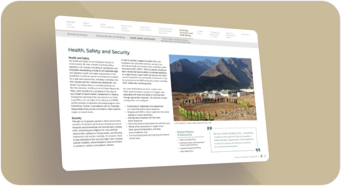 Franco-Nevada Corporation 31 Health, Safety and Security Health and Safety The health and safety of our employees remains of utmost priority. We have a Health and Safety Policy applying to our company (including all subsidiaries) and employees necessitating compliance with applicable legal and regulatory health and safety requirements of the jurisdictions in which we operate and setting out standards for a safe work environment, including a workplace free from injuries and from violence and harassment. Our Health and Safety Policy is complemented by our Non-Discrimination, Anti-Harassment & Equal Opportunity Policy, which provides for a procedure in the case of any incident of discrimination, harassment or violence, including the reporting of the occurrence to our Chief Legal Officer, the oversight of the policy by our CESGC, and the provision of education and training programs from time-to-time. Further, in accordance with our Corporate Responsibility Policy, we are committed to make a positive impact on social issues. Security Although our employees operate in office environments, members of technical and business development teams frequently travel domestically and internationally, including when conducting due diligence for new potential opportunities, auditing our existing assets, and attending conferences and investor meetings. On occasion, these include destinations that may have higher risks, including political instability, natural disasters, extreme climates, or pandemic, endemic and epidemic disease. In order to partially mitigate the safety risk to our employees who visit these locations, we rely on an international health and security service coordinator called International SOS (“ISOS”). ISOS has globally established alarm centres that have the ability to coordinate assistance on a regional level. Expert health and security information can be requested to be sent directly to personnel or may be accessed via the ISOS self-service portals, including ISOS’ Global site monitoring portal. Our Travel Safety Policy has been in place since 2022, which formalizes measures to mitigate risks associated with travel and seeks to minimize them through appropriate measures. The protocols include, among others, our employees: § Conducting an independent risk assessment of a travel destination before departure; § Engaging with ISOS to obtain applicable information relating to a travel destination; § Sharing travel itineraries with their team before departure; § Discussing elevated travel-related risks with their team; § Taking certain precautions in respect of air travel, ground transportation, and hotel accommodations; and § Communicating openly and reporting all incidents to their team. Lundin employees in a safety huddle at Caserones Mine in Chile Related Policies & Statements: § Health and Safety Policy § Non-Discrimination, Anti-Harassment & Equal Opportunity Policy § Corporate Responsibility Policy § Travel Safety Policy We have a Health and Safety Policy... necessitating compliance with applicable legal and regulatory health and safety requirements of the jurisdictions in which we operate and setting out standards for a safe work environment... Message from our CEO Report Highlights About Franco-Nevada Responsible Capital Allocation Community Contributions Good Governance and Shareholder Alignment Climate Action Transparency and Guiding Principles About this Sustainability Report Appendices Diversity, Inclusion and Well-Being Diversity and Inclusion Employee Benefits and Well-Being Human Rights, Non-Discrimination, Anti-Harassment and Equal Opportunity Health, Safety and Security