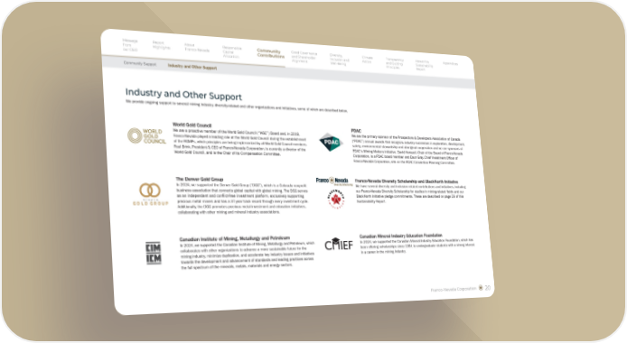 Franco-Nevada Corporation 20 World Gold Council We are a proactive member of the World Gold Council (“WGC”) Board and, in 2019, Franco-Nevada played a leading role at the World Gold Council during the establishment of the RGMPs, which principles are being implemented by all World Gold Council members. Paul Brink, President & CEO of Franco-Nevada Corporation, is currently a director of the World Gold Council, and is the Chair of its Compensation Committee. Franco-Nevada Diversity Scholarship and BlackNorth Initiative We have several diversity and inclusion related contributions and initiatives, including our Franco-Nevada Diversity Scholarship for studies in mining-related fields and our BlackNorth Initiative pledge commitments. These are described on page 29 of this Sustainability Report. The Denver Gold Group In 2024, we supported the Denver Gold Group (“DGG”), which is a Colorado nonprofit business association that connects global capital with global mining. The DGG serves as an independent and conflict-free investment platform, exclusively supporting precious metal miners and has a 37-year track record through every investment cycle. Additionally, the DGG promotes precious metal investment and education initiatives, collaborating with other mining and mineral industry associations. Canadian Mineral Industry Education Foundation In 2024, we supported the Canadian Mineral Industry Education Foundation, which has been offering scholarships since 1964 to undergraduate students with a strong interest in a career in the mining industry. Canadian Institute of Mining, Metallurgy and Petroleum In 2024, we supported the Canadian Institute of Mining, Metallurgy and Petroleum, which collaborates with other organizations to advance a more sustainable future for the mining industry, minimize duplication, and accelerate key industry issues and initiatives towards the development and advancement of standards and leading practices across the full spectrum of the minerals, metals, materials and energy sectors. PDAC We are the primary sponsor of the Prospectors & Developers Association of Canada (“PDAC”) annual awards that recognize industry successes in exploration, development, safety, environmental stewardship and aboriginal cooperation and we are sponsors of PDAC's Mining Matters initiative. David Harquail, Chair of the Board of Franco-Nevada Corporation, is a PDAC board member and Eaun Gray, Chief Investment Officer of Franco-Nevada Corporation, sits on the PDAC Convention Planning Committee. Industry and Other Support Diversity Scholarship G O L D G R O U P D E N V E R We provide ongoing support to several mining industry, diversity-related and other organizations and initiatives, some of which are described below. Message from our CEO Report Highlights About Franco-Nevada Responsible Capital Allocation Good Governance and Shareholder Alignment Diversity, Inclusion and Well-Being Climate Action Transparency and Guiding Principles About this Sustainability Report Appendices Community Contributions Community Support Industry and Other Support