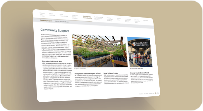 Franco-Nevada Corporation 18 Community Support Revegetation and Social Projects in Brazil We supported G Mining Ventures’ contribution to several environmental and social initiatives in the village of Jardim do Ouro and surrounding communities in Brazil, located near the Tocantinzinho mine site. The initiatives included (i) revegetation activities; (ii) road maintenance and dust management; and (iii) socio-environmental programs aimed at developing local suppliers. Social Initiatives in Idaho 2024 marked our second consecutive year supporting Perpetua Resources to develop future capacity needs. Perpetua’s community initiatives promoted workforce development through career technical programming and student scholarships and sponsored regional transportation, afterschool, and food security initiatives. Oncology Infusion Center in Nevada In 2024, alongside Nevada Gold Mines, we supported the construction and implementation of a 5,000 square foot oncology infusion center within the larger 30,000 square foot Elko Community Health Center to bring comprehensive cancer infusion care to Elko and its surrounding communities. We are committed to partnering with operators on community and environmental initiatives near their projects where we have royalty and stream interests. These partnerships benefit local communities and environmental initiatives and also strengthen our company’s and the mining industry’s reputation in the regions in which we invest. Recent initiatives over the years have included social and educational support programs, water and other infrastructure and community improvement projects, reforestation programs, recycling programs, workplace tragedy support, as well as mental health and COVID-19 relief efforts. Some of the community contributions funded by us in 2024 are described in further detail in this section. Educational Initiative in Peru 2024 represented our seventh consecutive year partnering with Compañía Minera Antamina S.A., the joint venture company that operates the Antamina project in Peru, in supporting Enseña Peru. Enseña Peru aims to improve education at existing schools in the region which Compañía Minera Antamina S.A. has historically supported and has the goal that by 2032, 8 out of 10 Peruvian youth will receive a quality education. Enseña Peru’s main objective is to supplement the Peruvian education ministry’s efforts in guiding volunteer teachers and other professionals through a three-month leadership program and then posting them in different schools and communities. Their other effort is to train existing teachers and increase cooperation through their Qué Maestro Program. Revegetation activities in Brazil Elko Community Health Center in Nevada Message from our CEO Report Highlights About Franco-Nevada Responsible Capital Allocation Good Governance and Shareholder Alignment Diversity, Inclusion and Well-Being Climate Action Transparency and Guiding Principles About this Sustainability Report Appendices Community Contributions Industry and Other Support Community Support