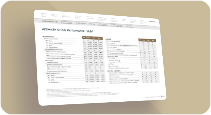Franco-Nevada Corporation 49 Appendix A: ESG Performance Table1 1 Unless otherwise noted, the figures in this ESG Performance Table relate to Franco-Nevada Corporation and all of its subsidiaries. 2 Workforce figures are determined as at December 31 of each applicable year. 3 Full-time employees for all of our corporate operations, in Toronto, Barbados, United States and Australia. 4 “BIPOC” means Black, Indigenous, and people of colour. 5 “Diverse Persons” includes women, Black, Indigenous and other racial or ethnic minorities, individuals who identify as LGBTQ2S+ and people with disabilities. 6 As of January 8, 2025, the number of directors increased to 10 Board members, of which 8 (80%) are independent directors, 3 (30%) are women, and 4 (40%) are Diverse Persons. 7 Part-time contractors exclude technical, ESG and other consultants that have not been engaged on a long-term/ongoing and/or retainer basis for our corporate operations. WORKFORCE 2 Unit 2024 2023 2022 Full-time employees (“FTE”)3 # 43 40 40 FTE – Women # (%) 19 (44%) 18 (45%) 17 (43%) FTE – Racial or ethnic minorities # (%) 18 (42%) 18 (45%) 18 (45%) FTE – BIPOC4 # (%) 18 (42%) 18 (45%) 18 (45%) FTE – Diverse Persons5 # (%) 27 (63%) 25 (63%) 24 (60%) Senior management (VP and higher) # 14 14 14 Women in senior management positions # (%) 2 (14%) 2 (14%) 2 (14%) Racial or ethnic minorities in senior management positions # (%) 5 (36%) 6 (43%) 6 (43%) BIPOC individuals in senior management positions # (%) 5 (36%) 6 (43%) 6 (43%) Diverse Persons in senior management positions # (%) 5 (36%) 6 (43%) 6 (43%) Board members6 # 9 8 11 Independent directors # (%) 7 (78%) 6 (75%) 9 (82%) Women on Board of Directors # (%) 3 (33%) 3 (38%) 3 (27%) Racial or ethnic minorities on Board of Directors # (%) Nil Nil Nil BIPOC individuals on Board of Directors # (%) Nil Nil Nil Diverse Persons on Board of Directors # (%) 3 (33%) 3 (38%) 3 (27%) Part-time contractors (“PTC”)7 # 6 5 5 PTC – Women # (%) 1 (17%) 1 (20%) 1 (20%) PTC – Racial or ethnic minorities # (%) 2 (33%) 2 (40%) 1 (20%) PTC – BIPOC # (%) 2 (33%) 2 (40%) 1 (20%) PTC – Diverse Persons # (%) 3 (50%) 3 (60%) 2 (40%) LABOUR Unit 2024 2023 2022 Collective bargaining agreements # Nil Nil Nil Strikes or lock-outs # Nil Nil Nil Labour violations or fines (e.g. age limits, wages, maximum hours and days) # Nil Nil Nil Human rights violations # Nil Nil Nil Reports of violence or harassment # Nil Nil Nil FTEs making greater than minimum wage % 100 100 100 FTEs making greater than living wage % 100 100 100 FTEs receiving vacation pay, sick pay and parental leave pay and receive health and other benefits % 100 100 100 Total FTE turnover # 3 2 5 Voluntary turnover of FTEs # 2 2 5 Involuntary turnover of FTEs # 1 Nil Nil New FTE hires # 6 2 9 Internal FTE promotions # 3 3 2 Employees receiving annual performance reviews % 100 100 100 HEALTH & SAFETY Workplace incidents relating to FTEs or contractors reported # Nil Nil Nil Lost days due to personnel or contractor workplace injuries # Nil Nil Nil Near miss frequency rate # Nil Nil Nil Workplace personnel or contractor fatalities # Nil Nil Nil Instances of occupational diseases among our personnel or contractors # Nil Nil Nil Health & safety fines, penalties, litigation, liabilities or settlements # Nil Nil Nil Message from our CEO Report Highlights About Franco-Nevada Responsible Capital Allocation Community Contributions Good Governance and Shareholder Alignment Diversity, Inclusion and Well-Being Climate Action Transparency and Guiding Principles About this Sustainability Report Appendices Appendices A: ESG Performance Table B: ISSB Sustainability Disclosure Standards C: SASB Disclosure E: Sustainable Development Goals F: KPMG: Independent Limited Assurance Report G: Carbon Neutral Initiative D: GRI Index