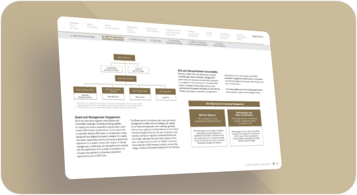 Franco-Nevada Corporation 52 ESG and Climate-Related Accountability Starting in 2020, ESG was adopted as a specific corporate goal used to evaluate management’s performance for executive compensation decisions, in recognition of the importance of managing ESG issues, including climate-related issues, to our business and the greater emphasis on ESG that the CESGC would apply in evaluating management’s performance. On an annual basis, the CESGC evaluates management’s performance in connection with ESG due diligence processes, ESG rankings, and other considerations. For further details as to this corporate goal and its subcomponents, please see the diagram below. ESG Objectives for Evaluating Management ESG Due Diligence ESG due diligence is critical in growing Franco-Nevada’s business ESG Rankings and Other Considerations ESG rankings and other considerations recognize management’s efforts with respect to ESG ESG due diligence will evaluate (i) whether appropriate ESG due diligence was presented to the Board in connection with new investments, and (ii) whether any ESG issues that actually occur were reasonably foreseeable through due diligence. ESG rankings will help inform the CESGC’s evaluation of management’s performance on ESG issues. Other considerations include progress made against corporate emission reduction target. Board and Management Engagement All of our executives regularly attend Board and Committee meetings, including providing updates on royalty and stream acquisition opportunities, which include ESG-related considerations. To the extent that a materially adverse ESG issue or consideration arises during the due diligence process in respect of a royalty and stream opportunity, such as community or government opposition to a project, issues with respect to tailings management, or otherwise, we may decide not to proceed with the opportunity. On a number of occasions, our company has passed on otherwise prospective opportunities due to ESG risks. The Board and its Committees also meet with senior management to determine our strategy with respect to our risks and exposures, with meetings generally held at every regularly scheduled Board and Committee meeting throughout the year. By way of example, most recently, during our regularly scheduled Board and Committee meetings that were held in March of this year, management met with the CESGC to discuss Franco-Nevada’s ESG strategy, including, among other things, climate and diversity initiatives for the company. Business Development Team Chief Investment Officer Diversified Team Senior Vice President, Diversified Compensation and ESG Committee* Finance Team Chief Financial Officer Audit and Risk Committee* Chief Executive Officer† Board of Directors* Legal Team Chief Legal Officer◊ * Board and Committees have oversight over ESG and climate-related risks and opportunities. † Chief Executive Officer has responsibility for leadership on ESG and climate-related matters. ◊ Chief Legal Officer has executive responsibility over ESG and climate-related matters. Message from our CEO Report Highlights About Franco-Nevada Responsible Capital Allocation Community Contributions Good Governance and Shareholder Alignment Diversity, Inclusion and Well-Being Climate Action Transparency and Guiding Principles About this Sustainability Report Appendices Appendices A: ESG Performance Table B: ISSB Sustainability Disclosure Standards C: SASB Disclosure D: GRI Index E: Sustainable Development Goals F: KPMG: Independent Limited Assurance Report G: Carbon Neutral Initiative